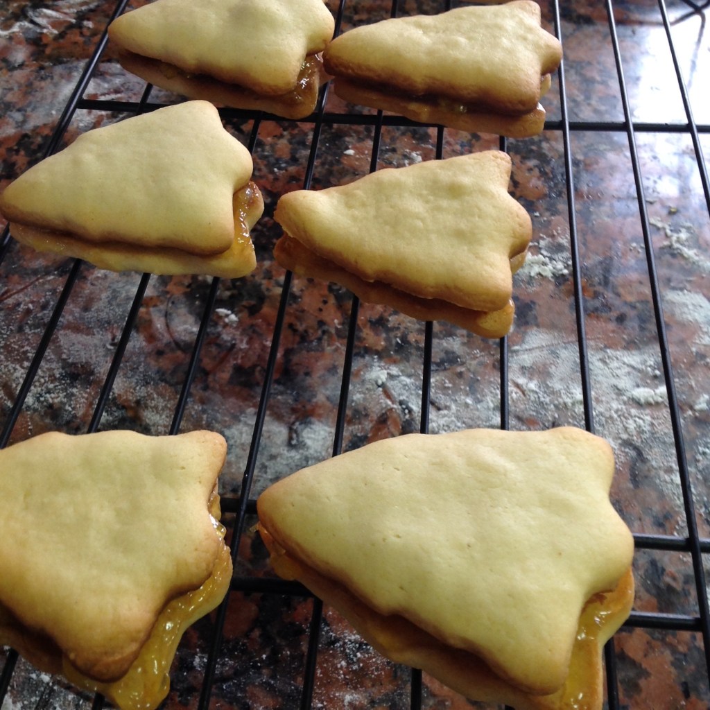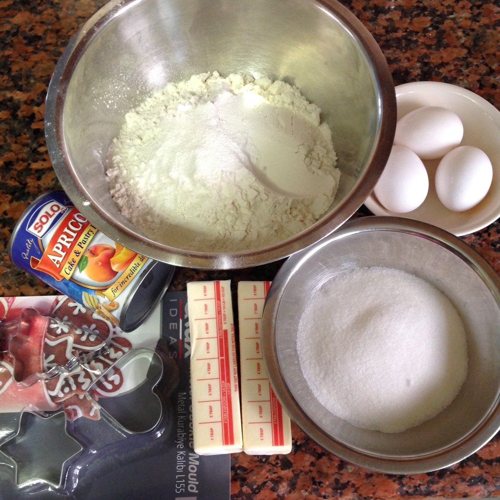 To get started you will need the following ingredients: butter, large eggs, self-rising flour, sugar, apricot spread and cookie cutters.