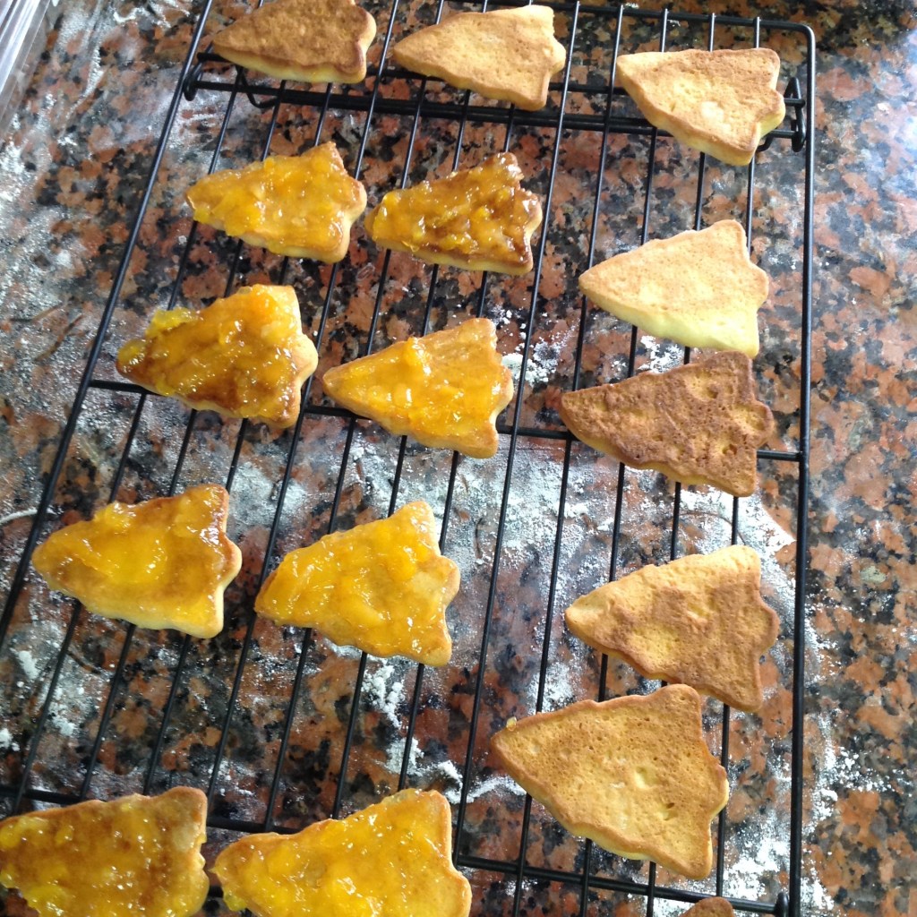 Step eight – Once cooled, flip them over so you can spread some apricot jam on half of them. I like to use canned apricot jam because the consistency holds better.