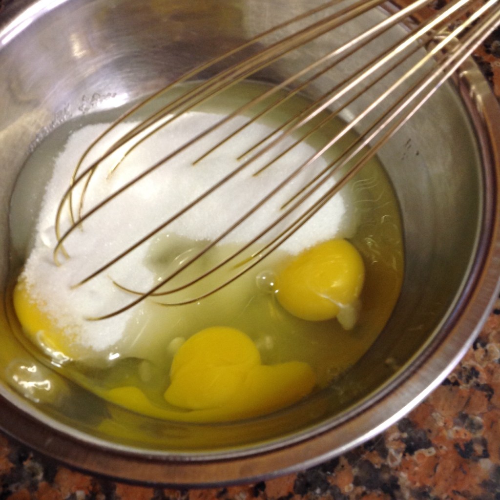 Step two – In a large bowl, mix together the eggs and sugar. Whisk for 5 minutes.