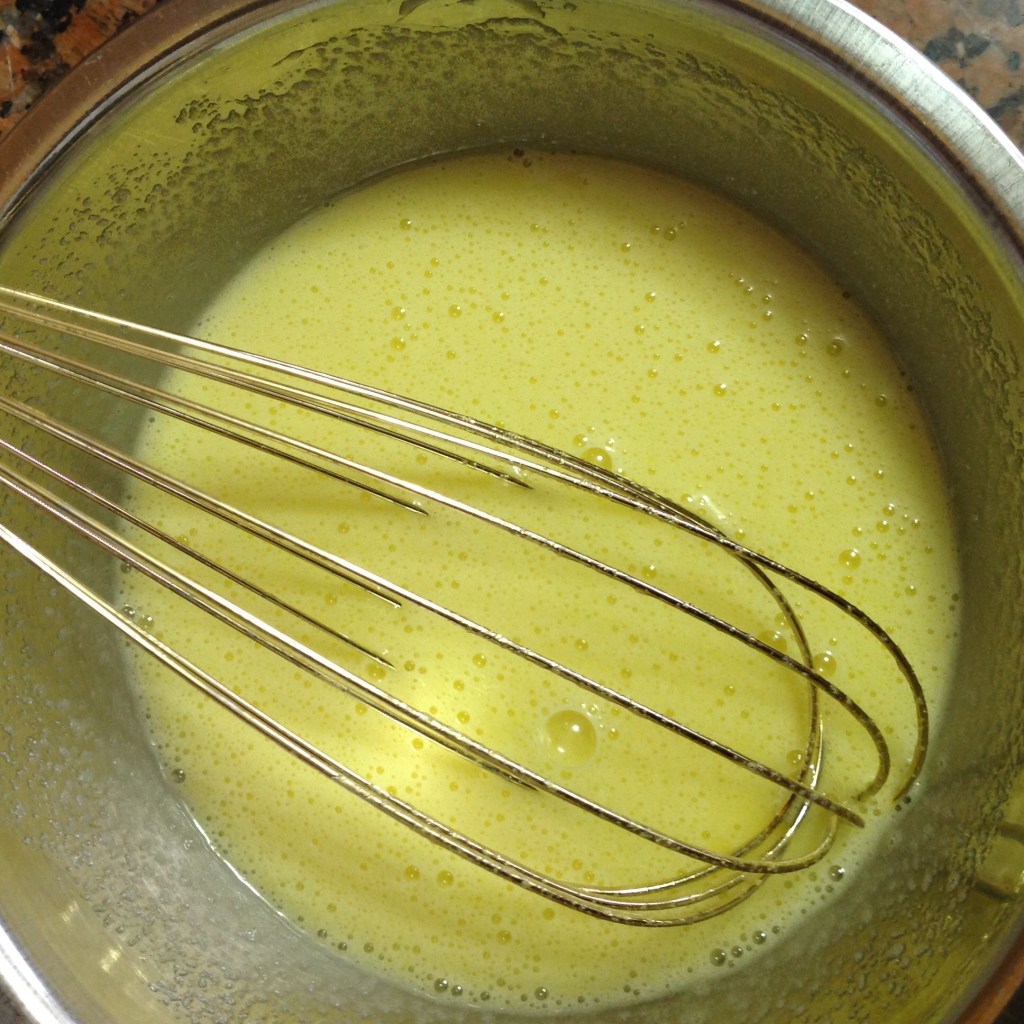 Step three – Pour the room temperature melted butter to the egg mixture, in a slow stream, whisk it in as you pour.
