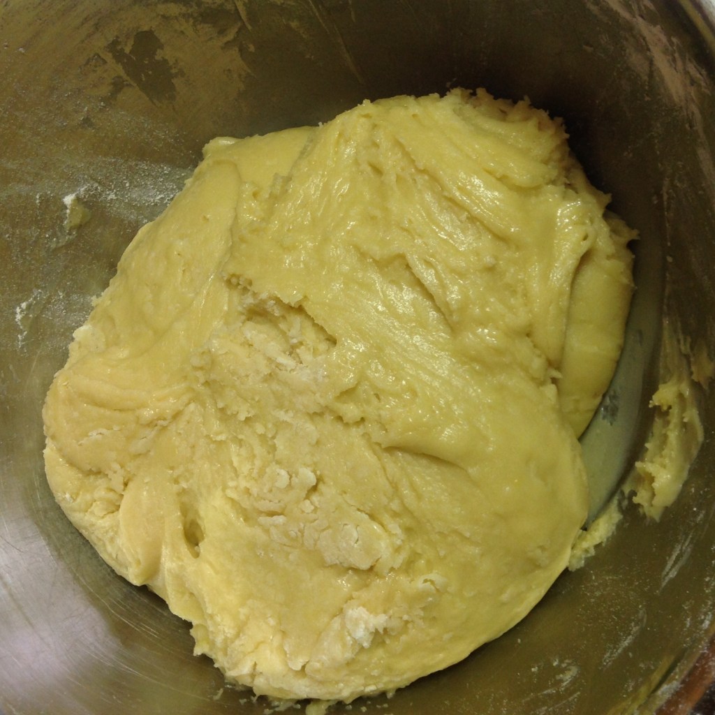 Step four – In small batches, add in the flour to the egg mixture. Stir to combine into a dough consistency. Once the dough comes together go ahead and cover it in plastic wrap to refrigerate for 30 minutes.
