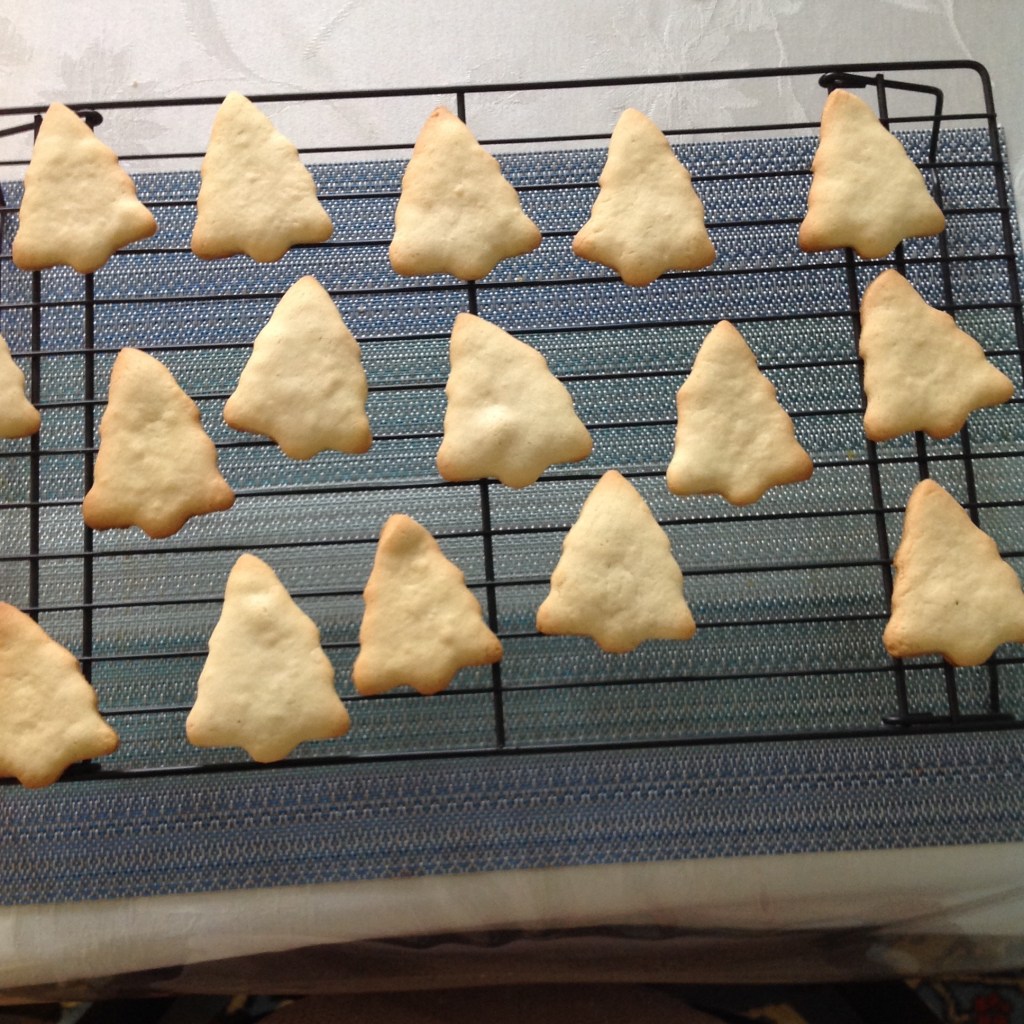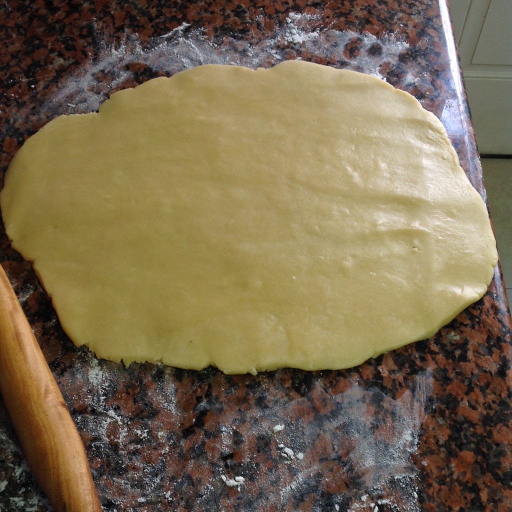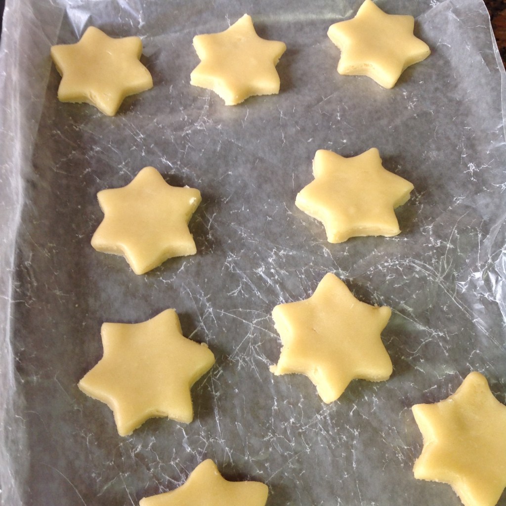 Step five – Pre-heat the oven to 375 F. Line two pans with parchment or wax paper. Roll out the dough to about 1/8″ thickness. I like to dust the counter with some AP flour to prevent it from sticking.