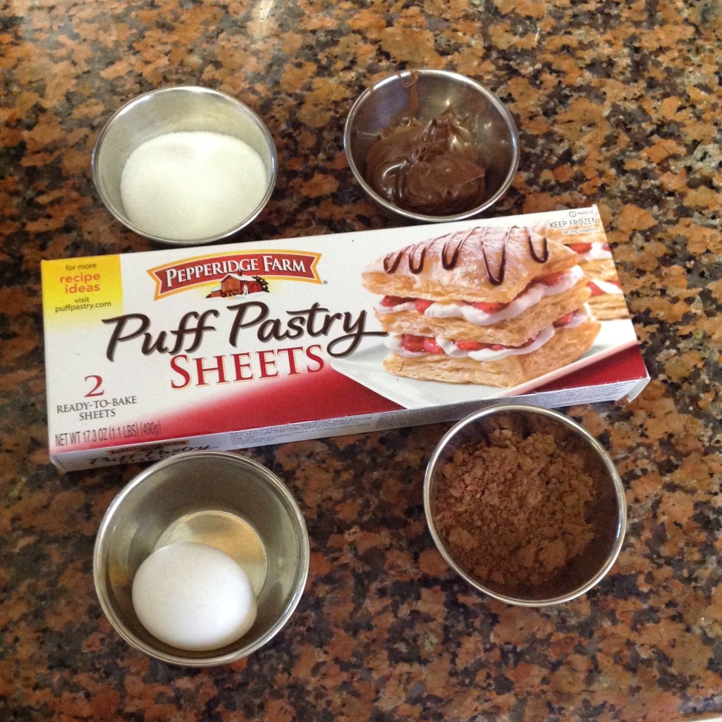 To start you will need the following ingredients, frozen puff pastry sheets, an egg, granulated or turbinado sugar, cocoa powder and chocolate hazelnut spread.