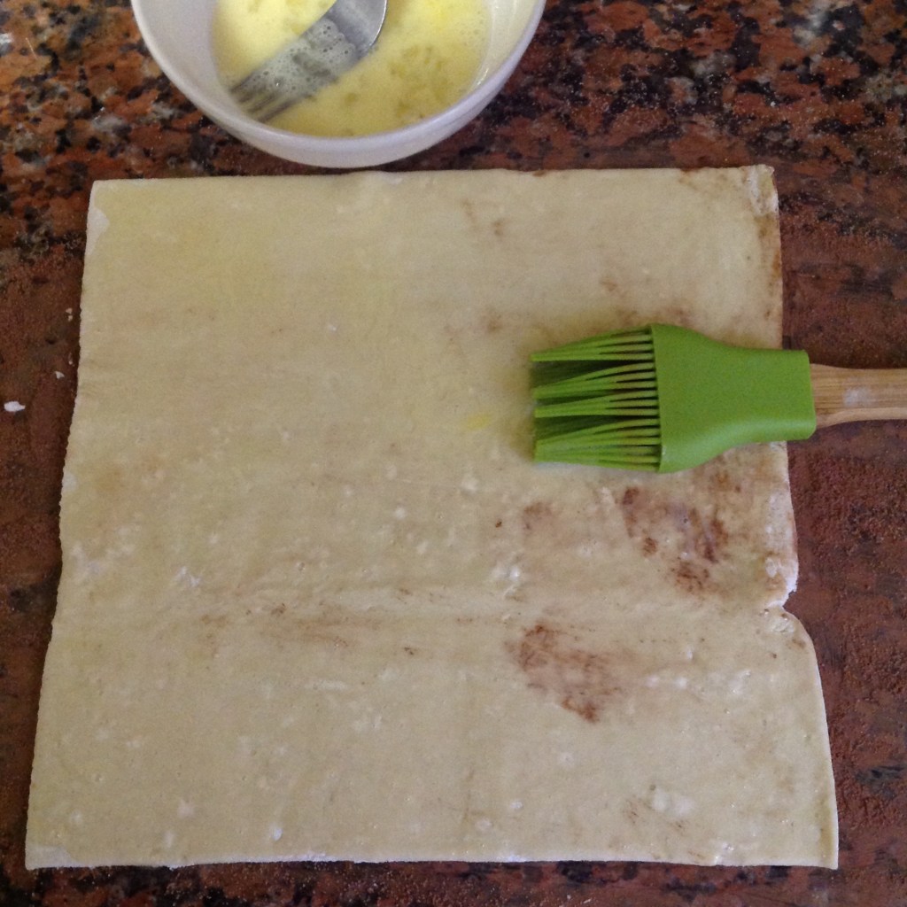 Step three: Unfold one thawed pastry sheet and brush with egg wash. Sprinkle the countertop with the cocoa-sugar mixture and then place the egg-wash side down on sugar mixture.