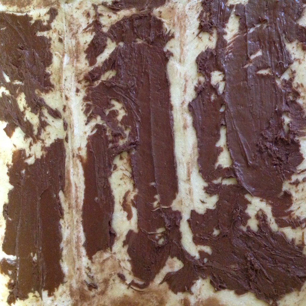 Step four: Coat the top of the pastry with the gooey chocolate hazelnut spread. This was the hardest part, it’s pretty tricky to spread this out, do your best!