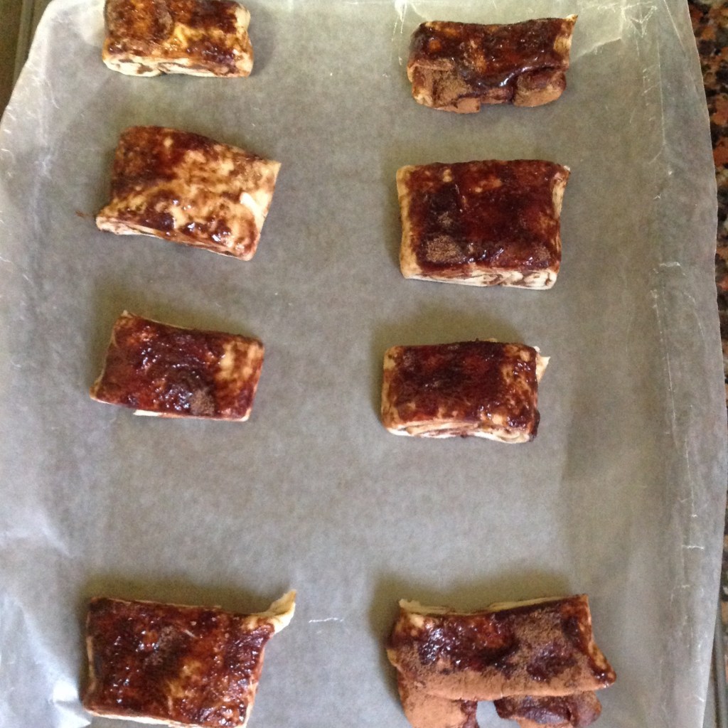 Step six: Preheat oven to 400 F. Line the baking tray with parchment or wax paper. Cut puff pastry rolls into 16 slices.