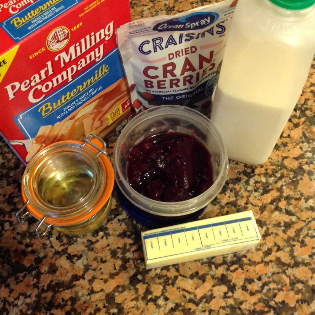 For this recipe, you will need pancake mix, cranberry sauce, milk, oil, butter and dried cranberries.