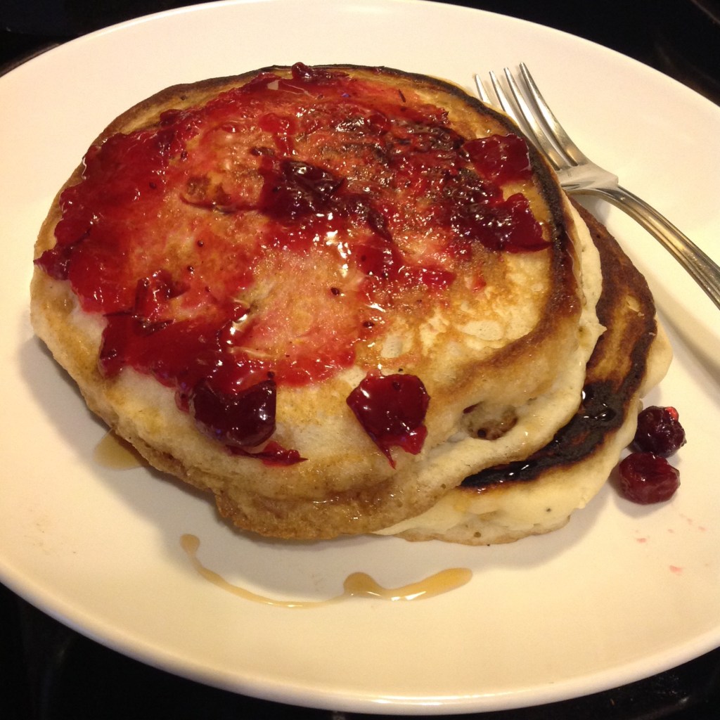 To serve, top it off with cranberry sauce and maple syrup. Either, or, or both depending on preference! Enjoy some delicious pancakes this weekend and use up that cranberry sauce, it’s a sure hit. Bon Appetit!