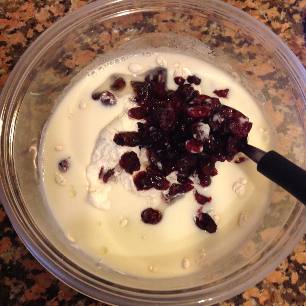 Step four: Measure out 1/2 cup dried cranberries and add to mix.