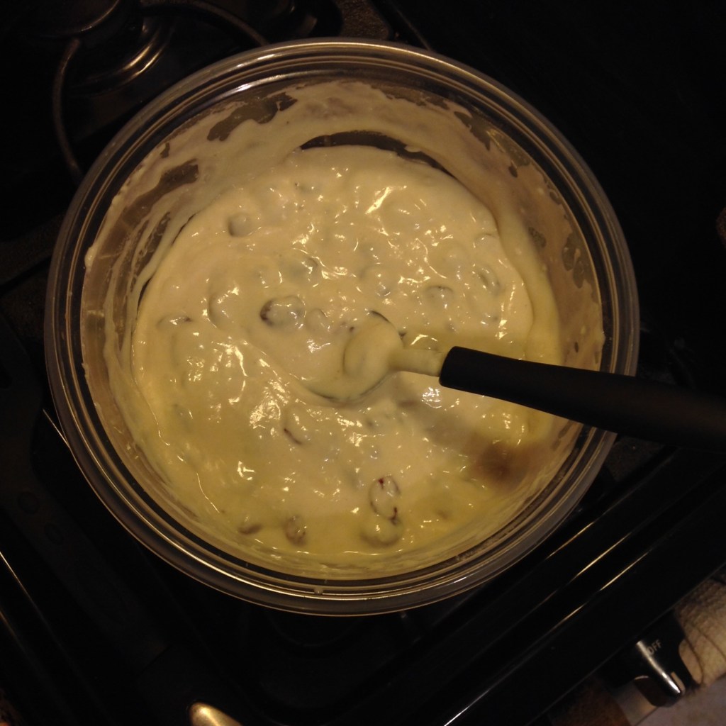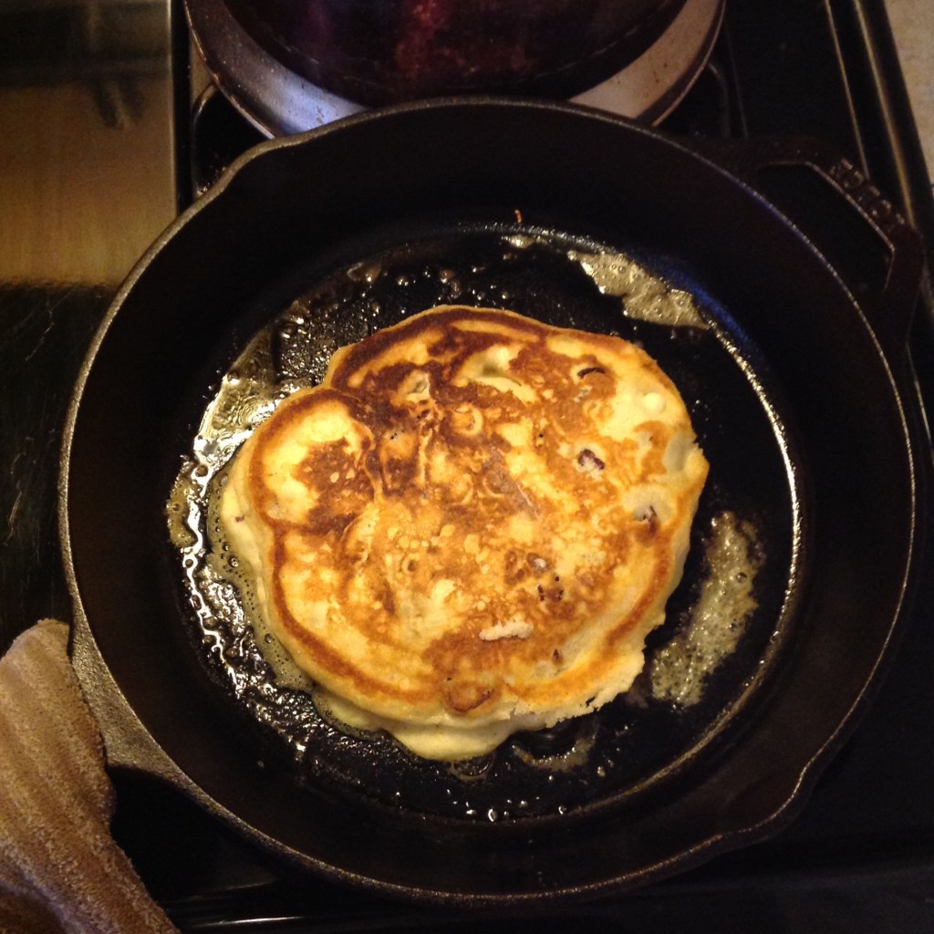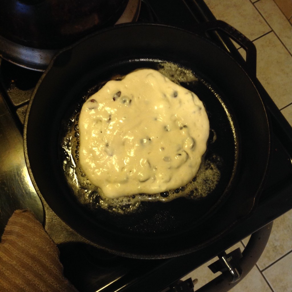 Step six: Turn heat on to medium and add a little butter to pan. Pour about 1/3 cup batter to hot pan. Set the timer to 90 seconds for the first side and then flip. Set the timer to another 60-90 seconds for 2nd side.