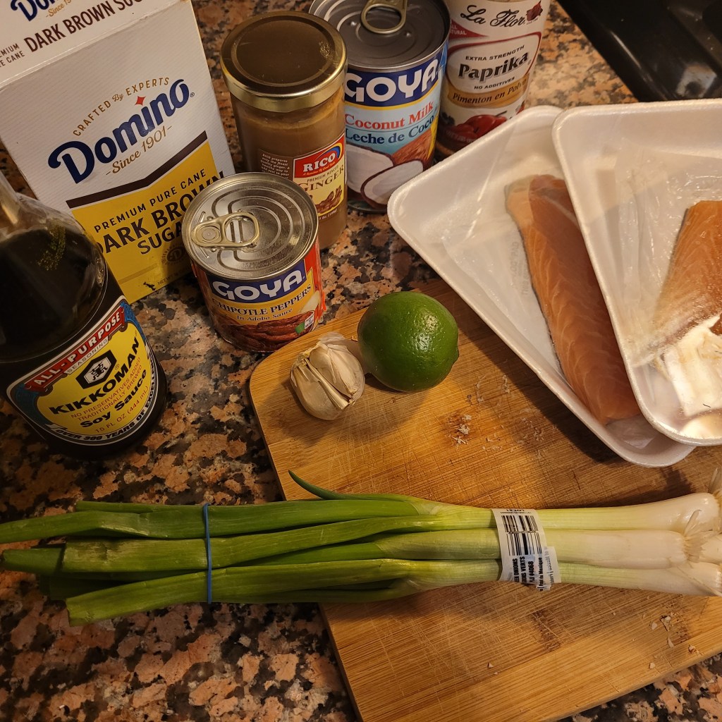 You will need the following ingredients: olive oil, scallions, fresh lime, coconut milk, chipotle peppers, soy sauce, dark brown sugar, ginger paste, garlic, salmon fillets, paprika, salt and pepper.