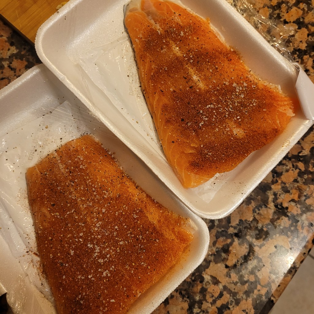 Step One: Turn the stove on to medium heat to prepare the skillet, add a tablespoon of olive oil. Season your salmon on the flesh side with salt, pepper and paprika.