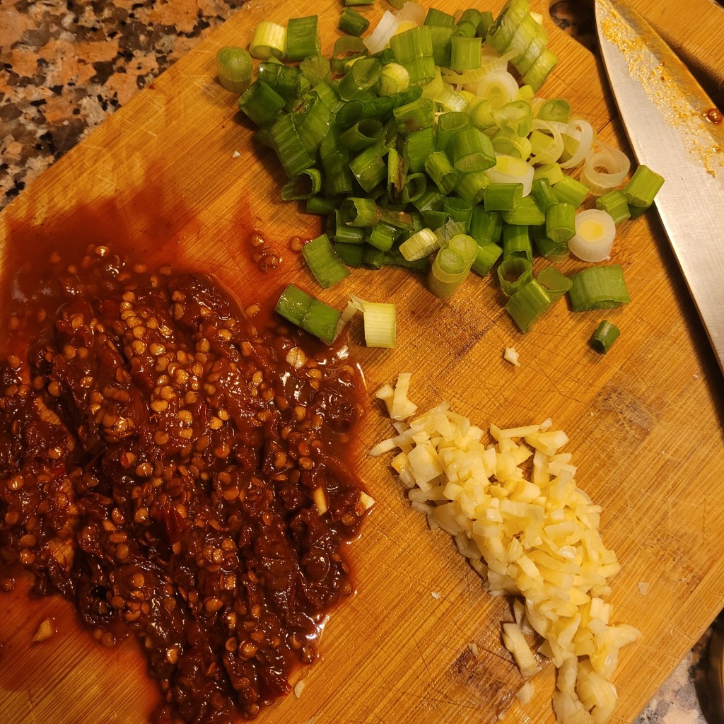 Step three: Chop up the garlic, scallions and chipotle peppers. Reduce heat to medium-low and add a tablespoon of olive oil. Add the garlic and ginger paste to skillet. Stir for 1 – 2 minutes.