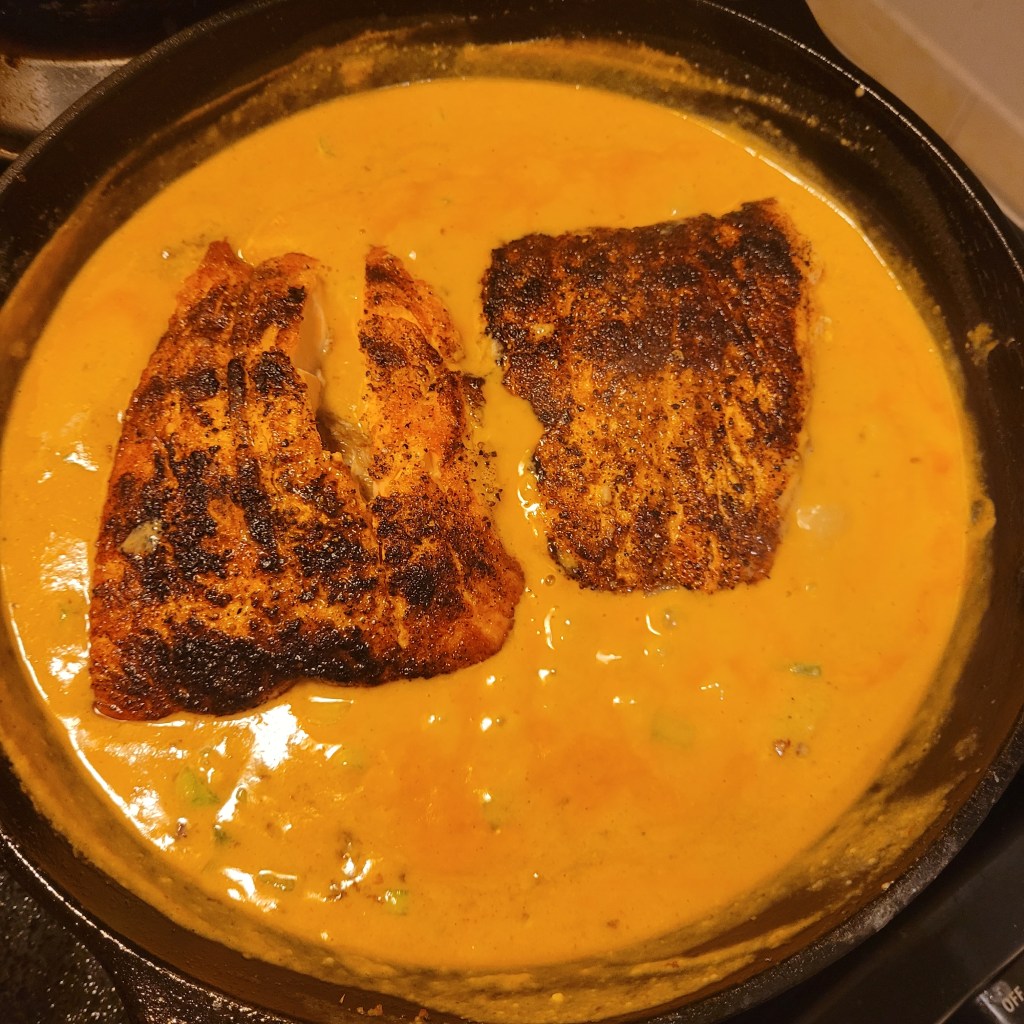 Step six: Turn off the heat and afterwards place the salmon back into skillet and baste the salmon with sauce. We do not want to overcook the salmon at this point. The color of chipotle – coconut lime sauce should be a beautiful golden orange! I mean just WOW look at this color!! Serve salmon on a plate of rice, garnish with scallions on top and drizzle the sauce around the plate for finishing touches. Enjoy!