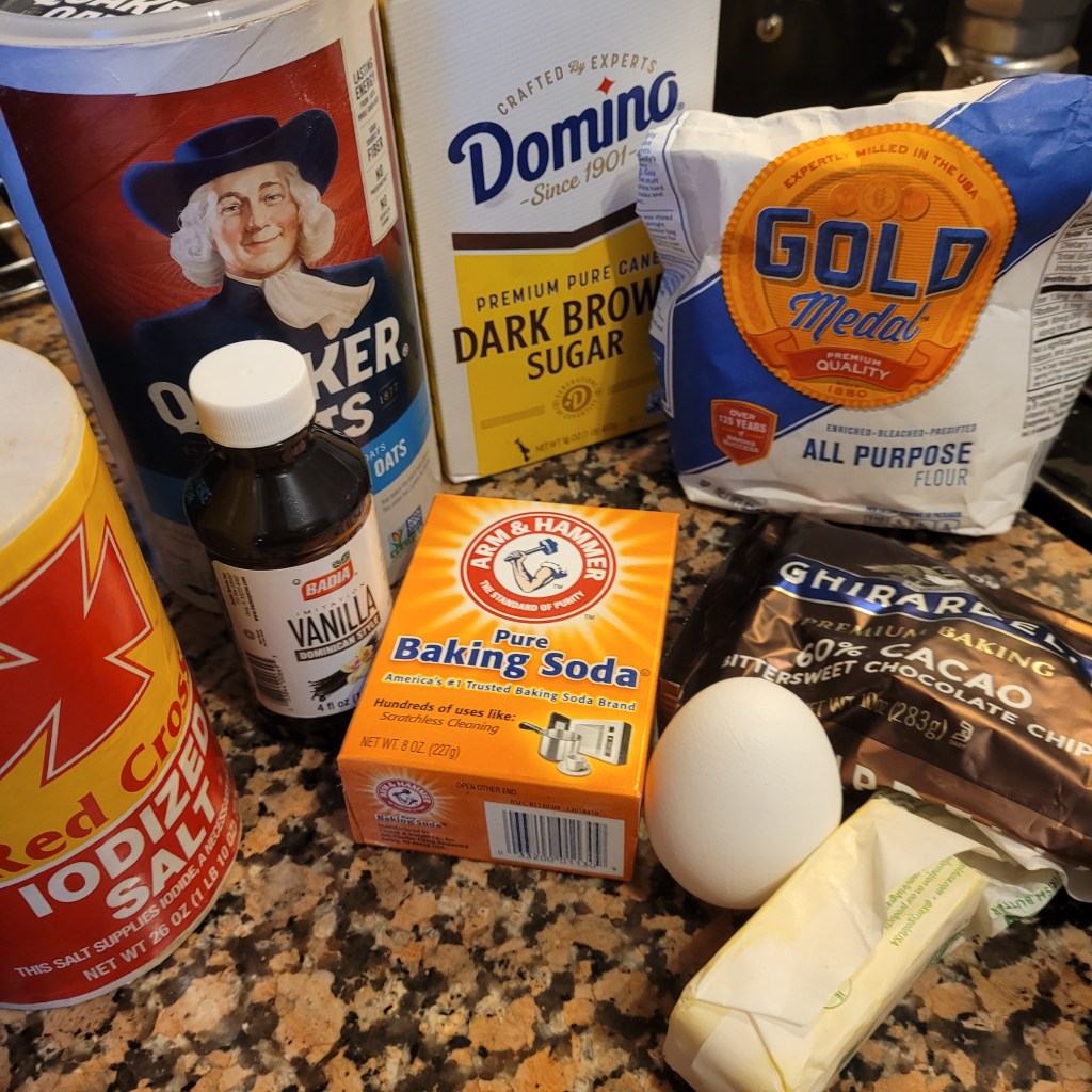 Step one: Pre-heat the oven to 350 degrees F and grease your baking tray. Mix the dry ingredients in a mixing bowl. That will include the oats, AP Flour, baking soda and the salt. NOT the dark brown sugar, that will be used in the next step.