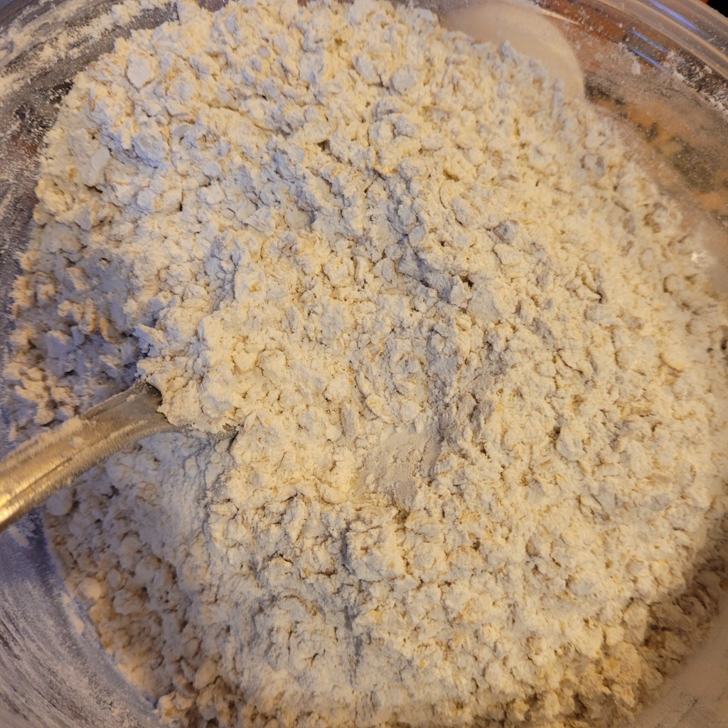Step three: Combine the dry & wet ingredients together until it comes together. If the batter is dry, go ahead and add some milk to moisten it. At this point you can fold in the chocolate chips, make sure they are evenly spread.