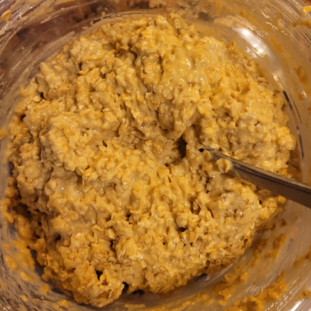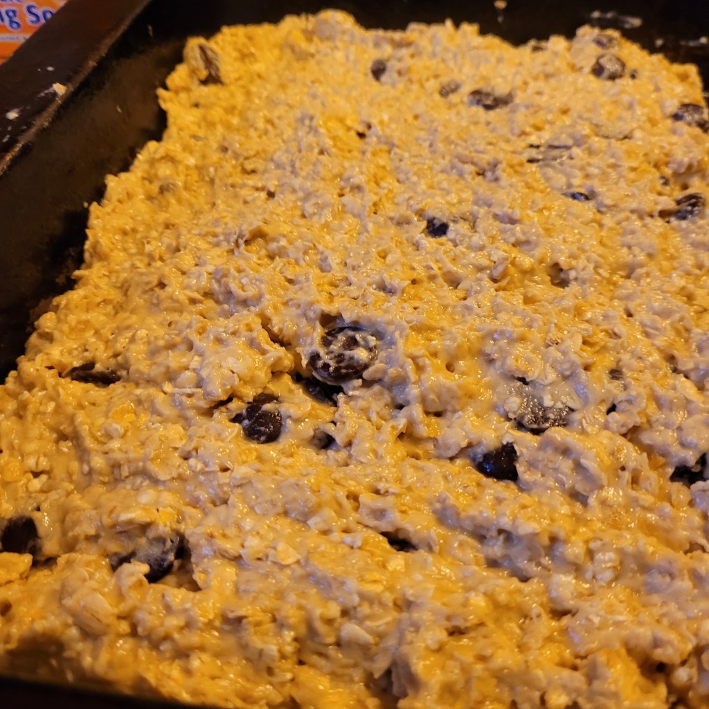 Step four: Pour the oat mixture into the greased tray, spread evenly. Bake for 10-15 minutes. Once the timer is up, remove from oven and set aside to cool off.