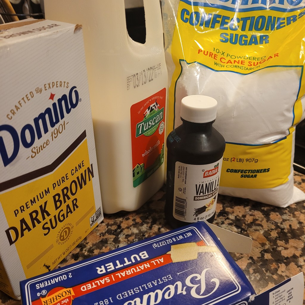Step Five: Let’s make our yummy caramel glaze now. You will need milk, vanilla extract, butter, dark brown sugar & powdered sugar.