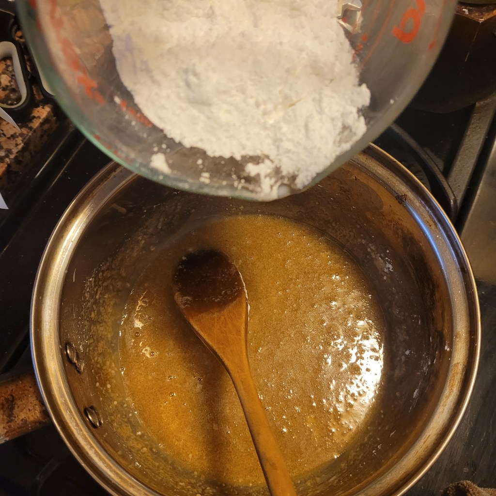 Step seven: Slowly add the powdered sugar little by little. You NEED to stir continuously and keep your focus on the caramel glaze.