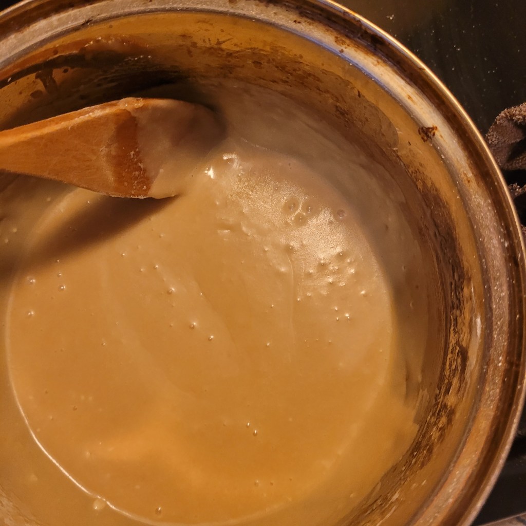 Step six: In a saucepan, on medium heat, combine the milk, butter and dark brown sugar. Bring to a boil while continuously stirring and then turn off heat.
