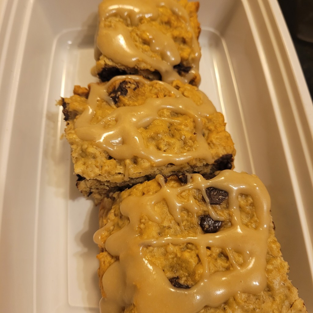 Step nine: Immediately drizzle caramel glaze over the chocolate chip oatmeal bars. I had mine cut up prior to drizzling the glaze and placed into a tupperware for someone to enjoy. I hope you make this tasty snack and tell all of your friends! Enjoy!