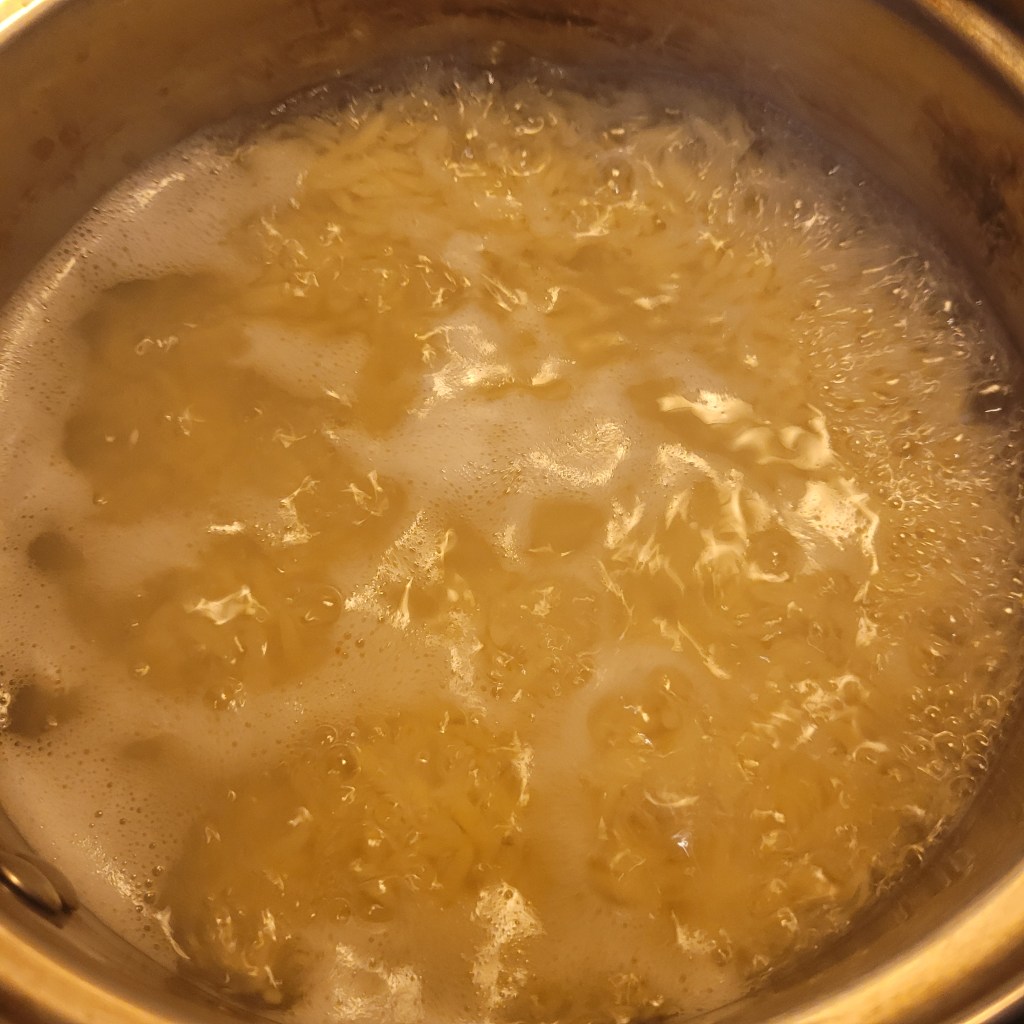Step one: Bring a pot of water to a boil, add some salt then add the orzo. Cook for about 8-9 minutes.
