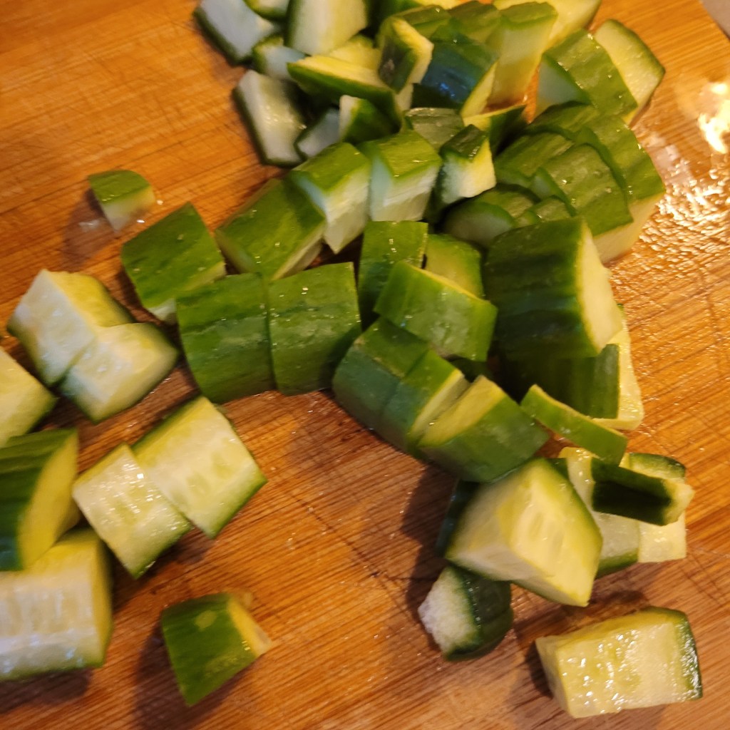 Step four: Wash the cucumber and then cut into four long strips. Then proceed to give them a good chop into small pieces. Add them to the orzo.