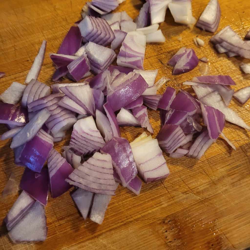 Step five: I used half of one large red onion here. I gave them a chop into bite sized pieces. Add them to the orzo.