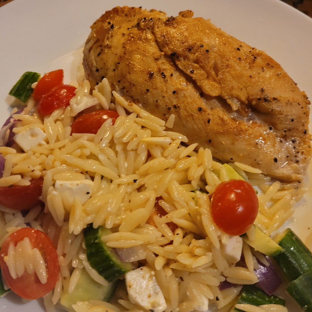 For the ingredients I have to give y’all a heads up. In the photo above, I actually did not end up using the chickpeas because I simply forgot however feel free to keep them! Also for the dressing, after tasting I did add some honey which is not shown in the photo. This is just a part of cooking, when you taste, you adjust as necessary. The chicken you can cook however you like, I did not include the method I used because the focus is on the orzo salad. You will need orzo, red onion, cucumber, cherry tomatoes, feta, lemon, dijon mustard, honey, red wine vinegar and olive oil.