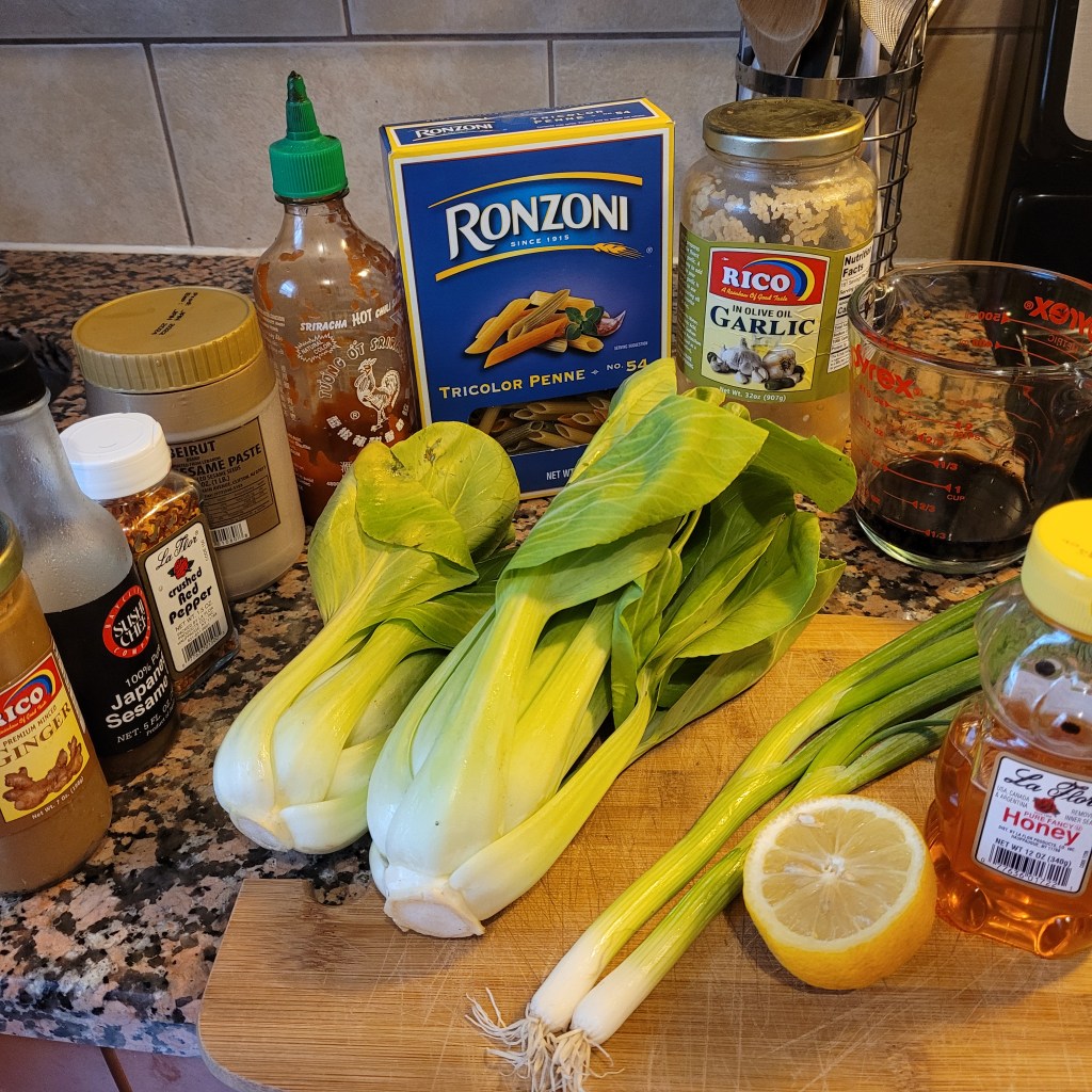 The ingredients you will need are; penne pasta, bok choy, tahini, soy sauce, red wine vinegar (not shown in photo), sriracha, sesame oil, honey, garlic, ginger, red pepper flakes, water, green onions and lemon juice.