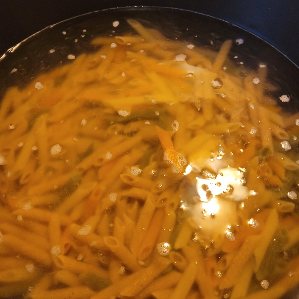 Step one: Bring a pot of water to a boil, DO NOT add salt. Once the water boils add the pasta and cook for about 7 minutes.
