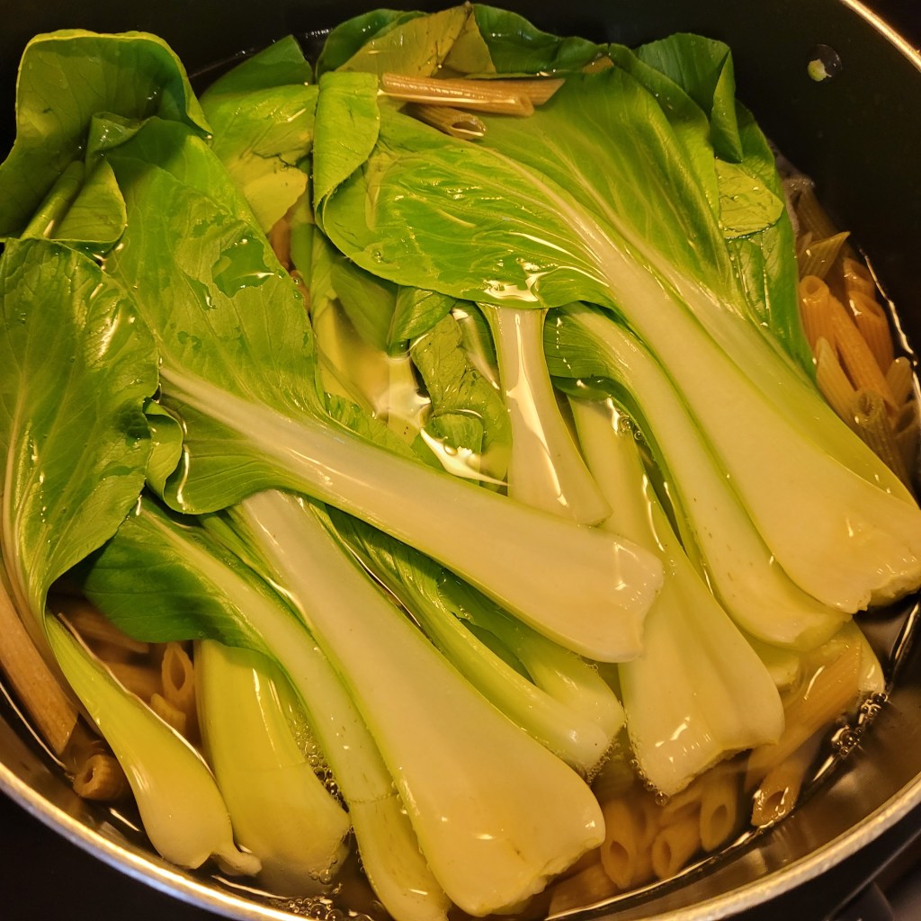 Step four: When the timer for the pasta approaches 3 minutes, go ahead and place all of the bok choy into the pot. Make the water submerges it so it can cook properly. Then remove the bok choy and drain the pasta.