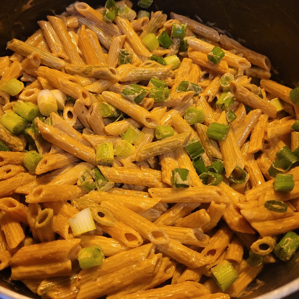 Step five: Chop the green onions after you give it a quick rinse. Place the pasta back in the pot with the sauce. Mix thoroughly. Add the green onions. At this point I did add just a pinch of salt.