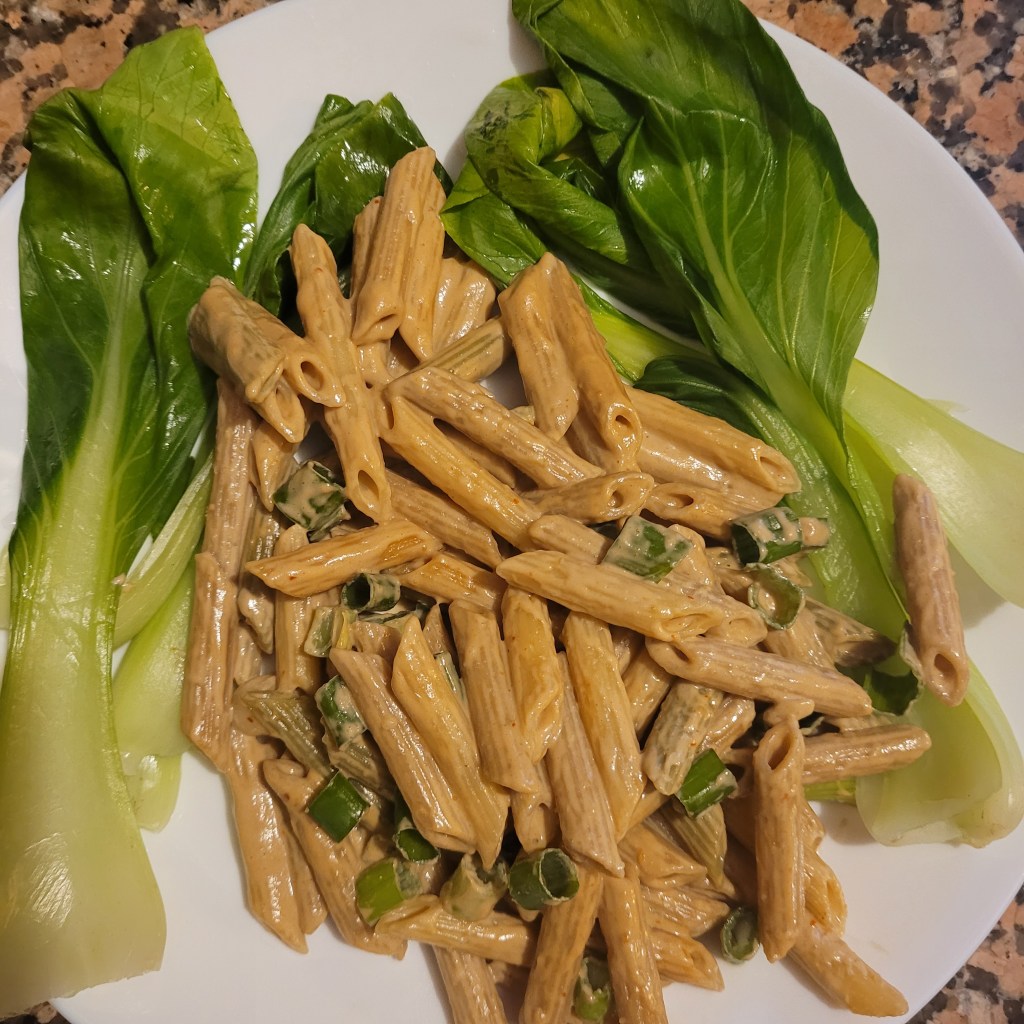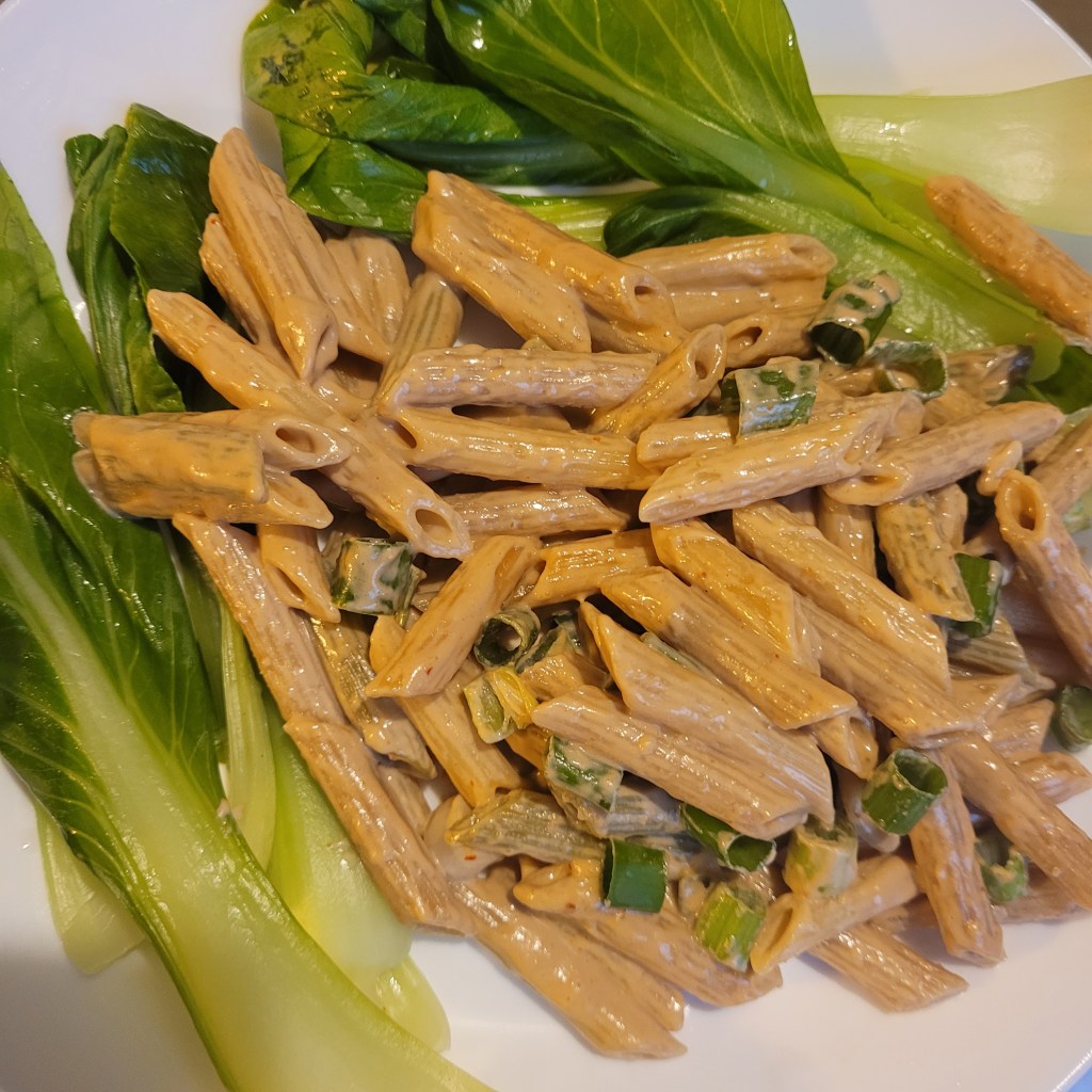 Serve your tahini pasta and arrange the bok choy around it like so. I think it looks so good like this! Personally, for the protein I did cook chicken sausage and it all tasted sooo good together. Highly recommend. Enjoy and leave a comment down below!