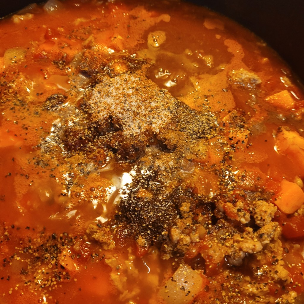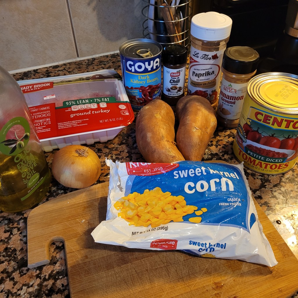 The ingredients you will need are; ground turkey, sweet potato, corn, onion, can of diced tomatoes, canned kidney beans, olive oil, garlic & vegetable stock (forgot to include in photo) and of course seasonings. Make sure you thaw the corn if it’s frozen.