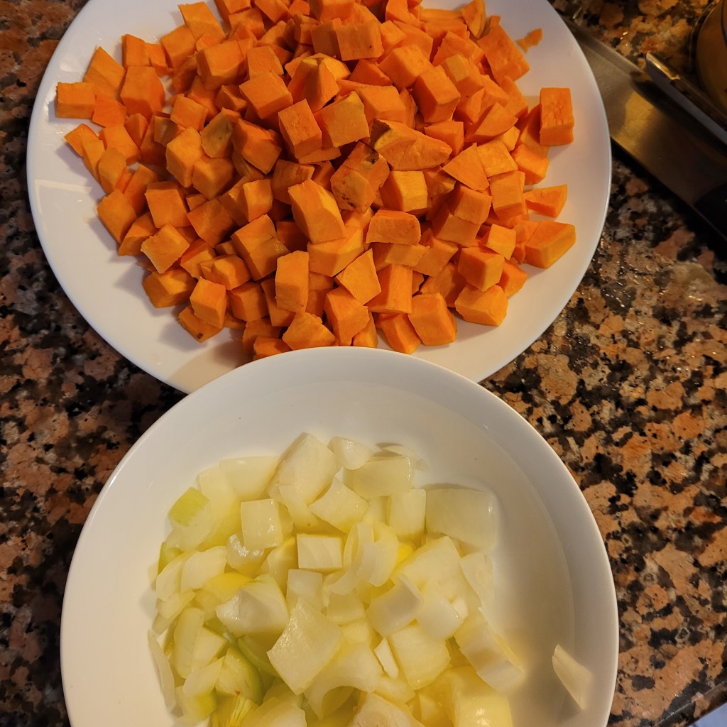 Step one: Prep your sweet potato and onions. I peeled off the skin on my sweet potatoes and gave them a good wash too. I like to cut the sweet potato into about an inch or less so it cooks properly otherwise it will take far too long.