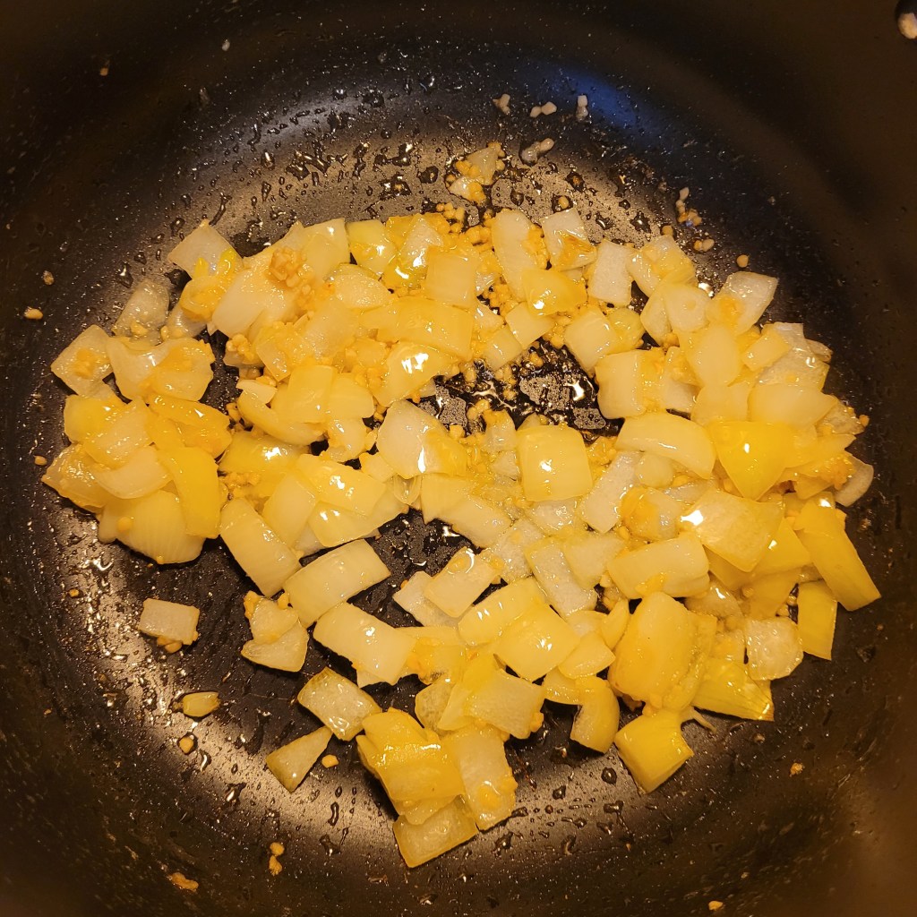 Step two: Heat your heavy bottom pot to medium and add olive oil. Once hot, add the onions and sauté for about 3 mins. Then add the garlic and give it a stir so it doesn’t burn.