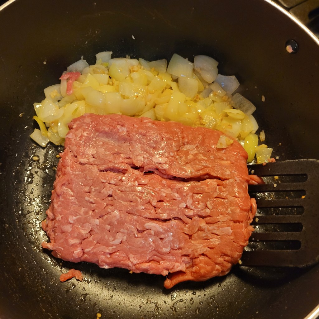 Step three: Push the onions off to the side and add the ground turkey. Break it apart and cook for 6-8 mins. Stir frequently.