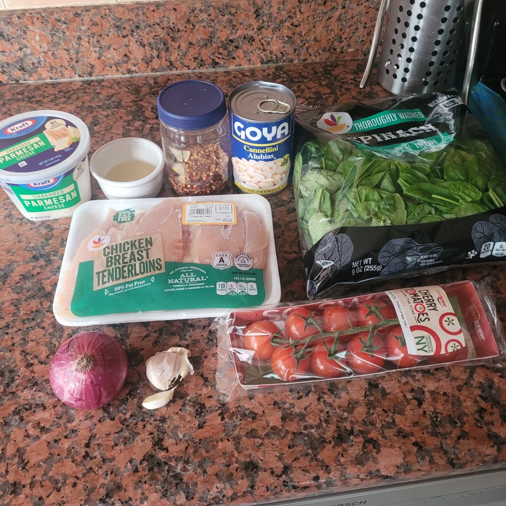 The ingredients you will need are: olive oil, chicken tenders, cherry tomatoes, an onion, garlic, spinach, lemon juice, parmesan cheese, cannellini beans, red pepper flakes and of course salt pepper for seasoning.
