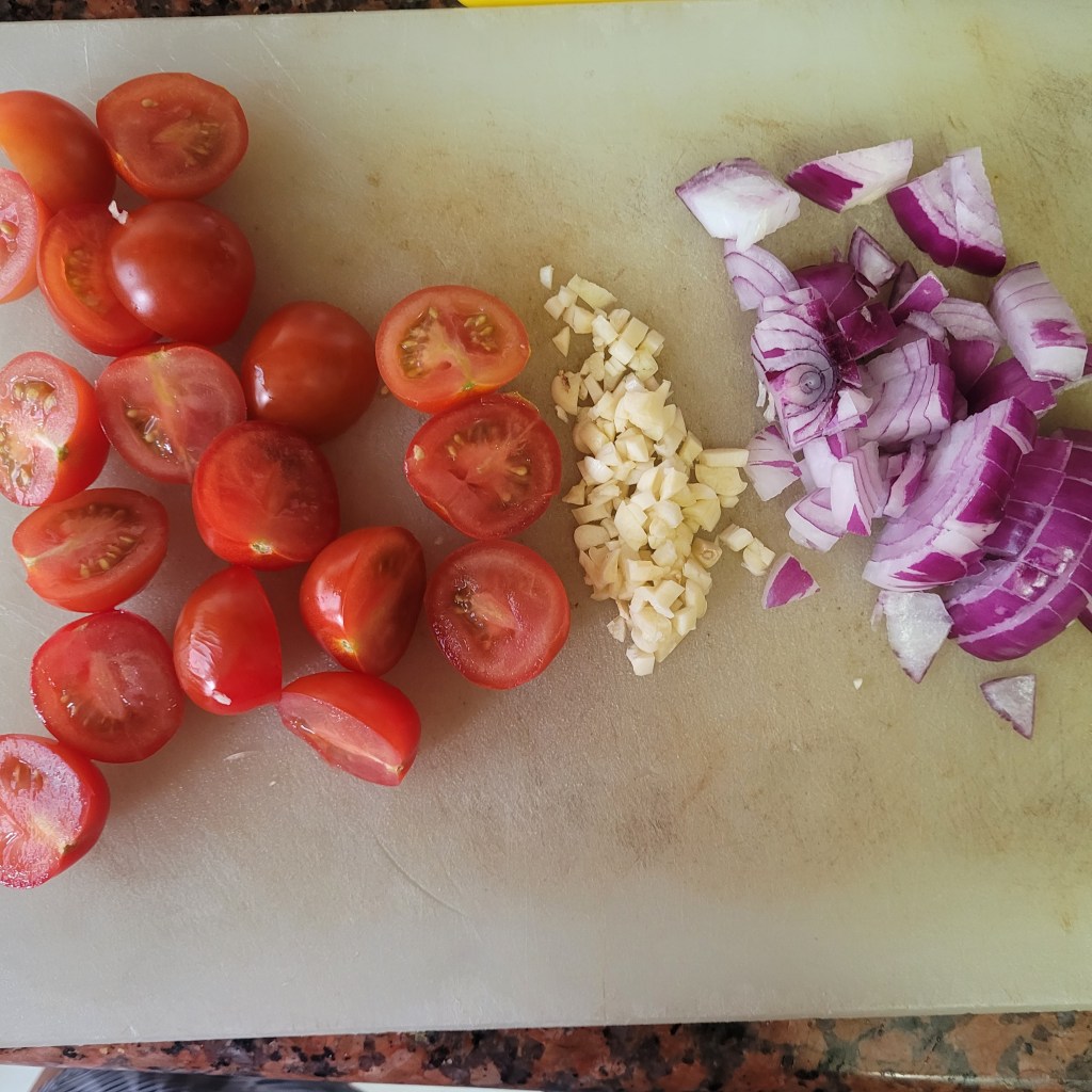Step two: Prep your onion, cherry tomatoes and garlic. Slice the cherry tomatoes in half after giving them a rinse. Dice the onion and garlic.