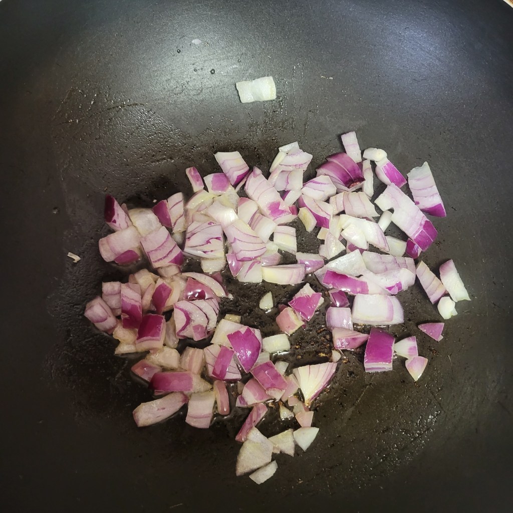 Step three: In a large heavy bottom nonstick pan, on medium low heat, add the olive oil. Once it’s hot add the onion and sauté for 5 minutes while stirring often.