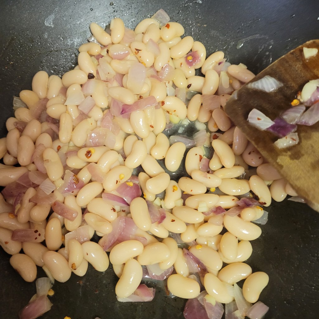 Step five: After you drain the water from the beans, pour them into the pan. Add the red pepper flakes. Cook for 2 minutes and stir every so often.
