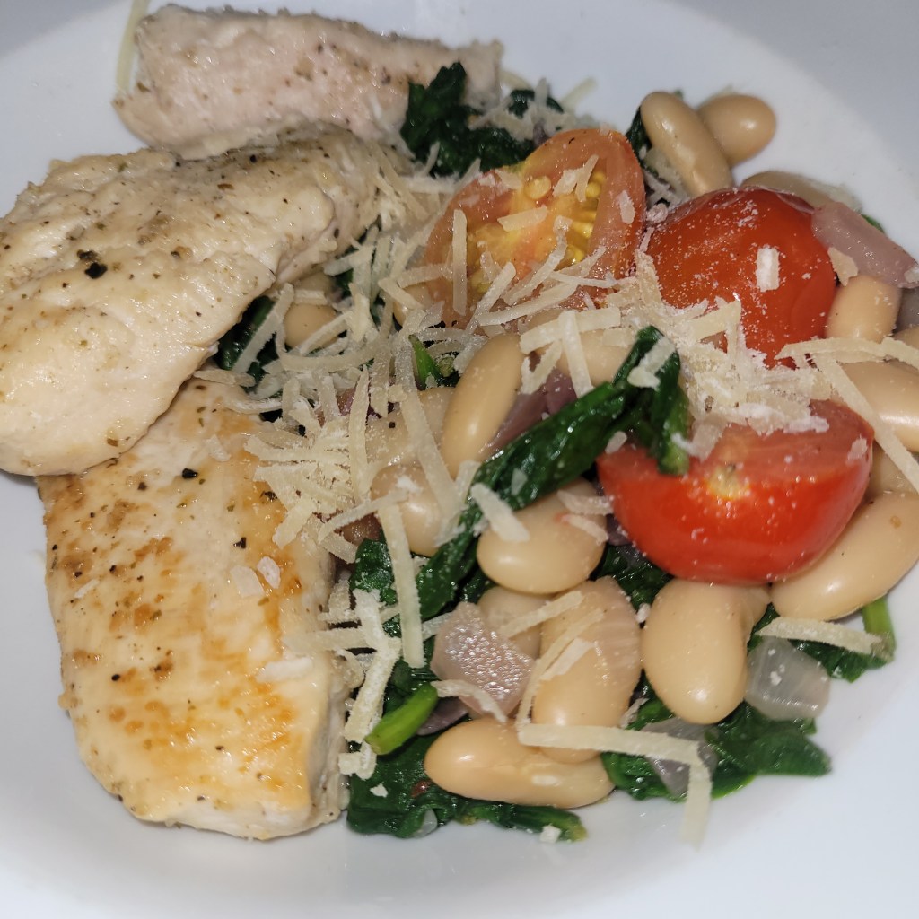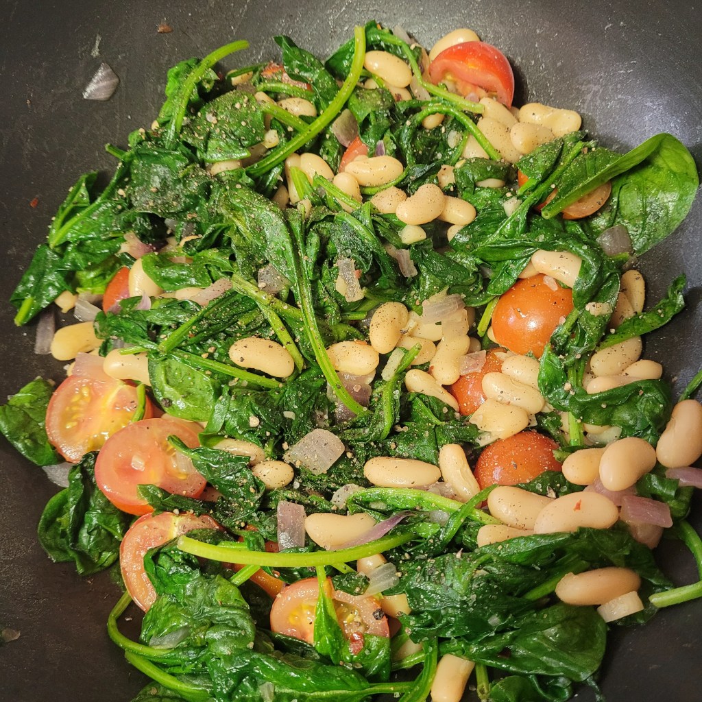 Voila! A healthy and delicious dinner recipe that is perfectly cooked. The cherry tomatoes are still plump and will pop in your mouth once bitten, the spinach is lemony, the beans are soft yet still thick. Top off the dish with some parmesan cheese and you’re good to go! Enjoy!