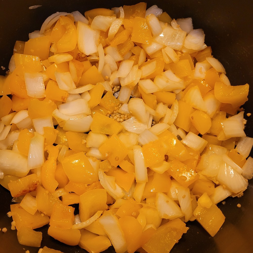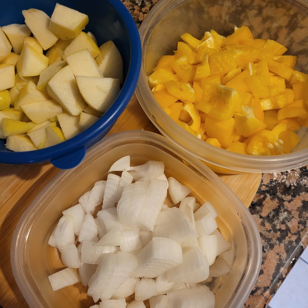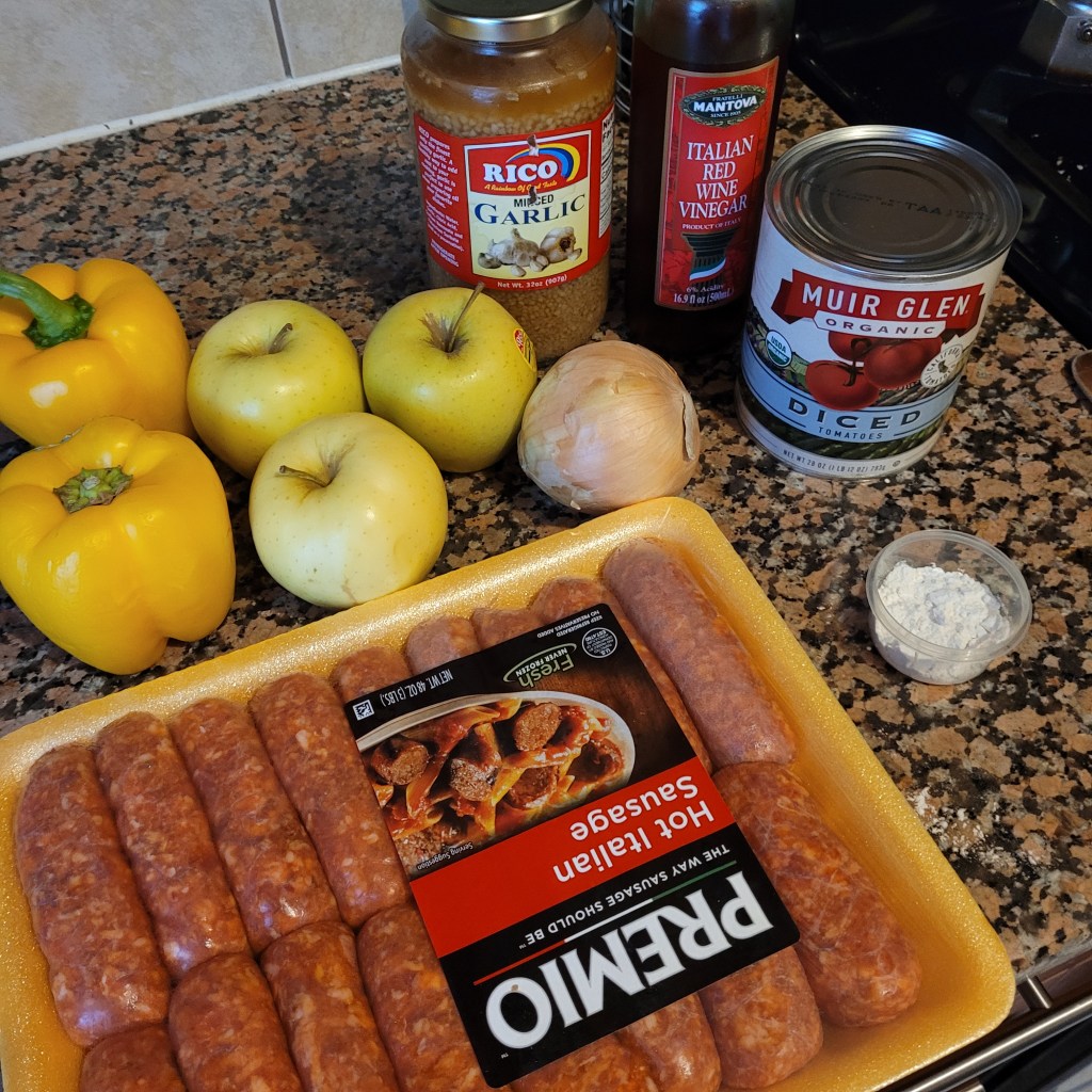 Ingredients: Sausages, white onion, apples, bell peppers, veggie stock (not shown), garlic, red wine vinegar, diced tomatoes and either flour or cornstarch.
