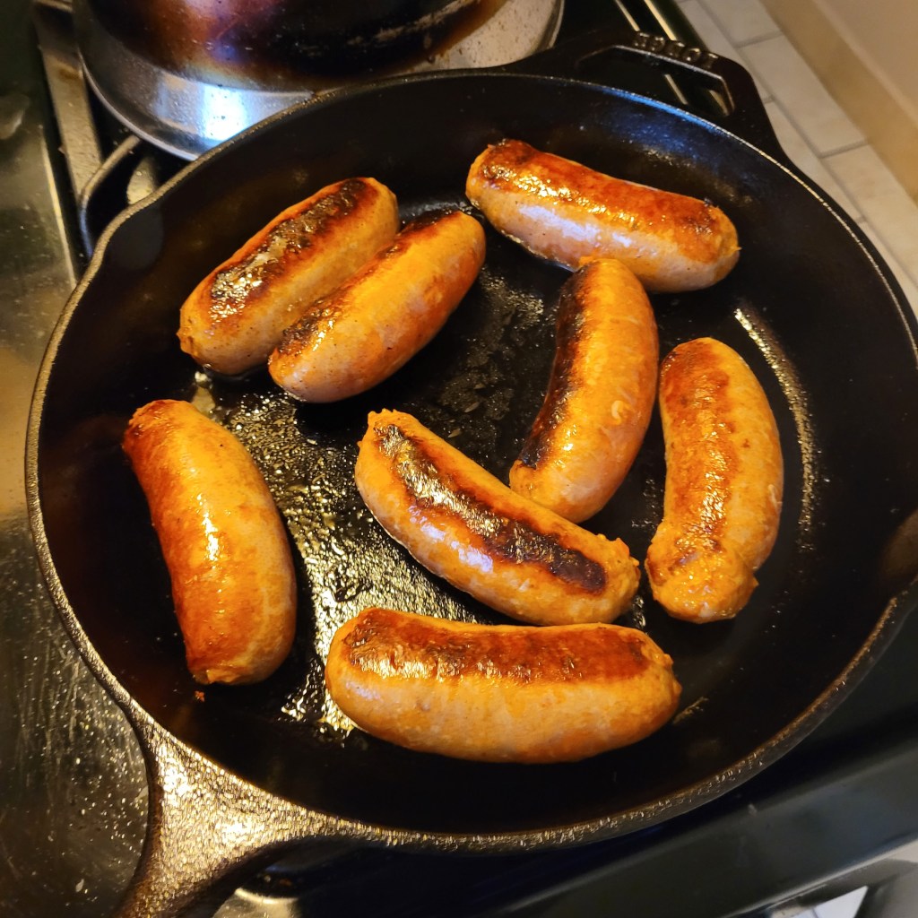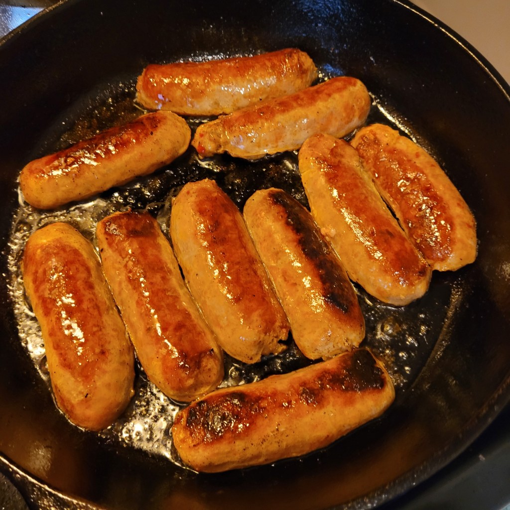 Step one: Cook the sausages on each side for 5 minutes on medium heat. You can do this method by leaving them whole OR slice them raw in half and then cook each side for 4-5 minutes. If you leave them whole, you will need to slice them in half later to cook the inside… see further instructions & photos.