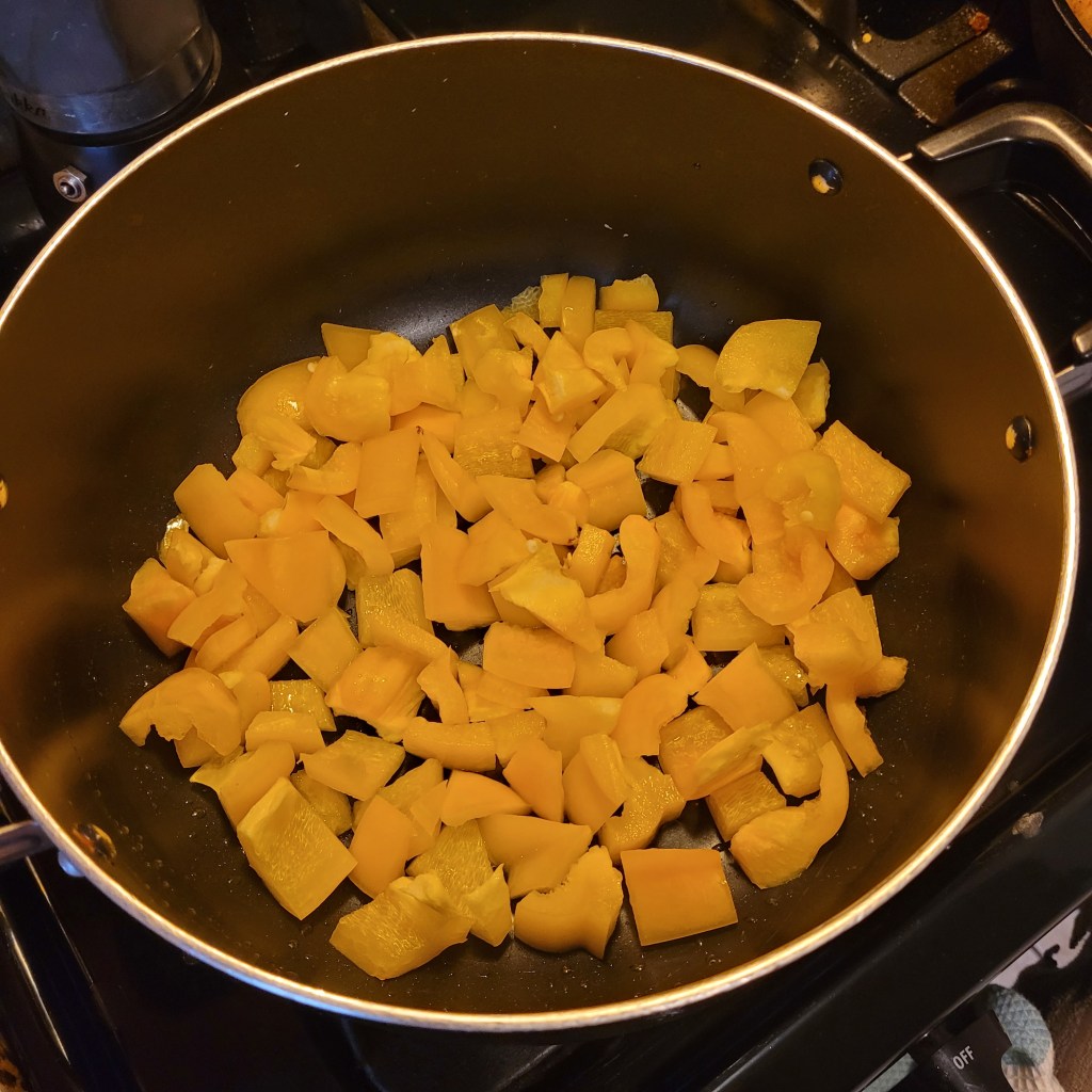 Step four: (Top left) First cook the sliced bell peppers in a large pot in about 2 tbsp of olive oil. Cook for 3-4 minutes.