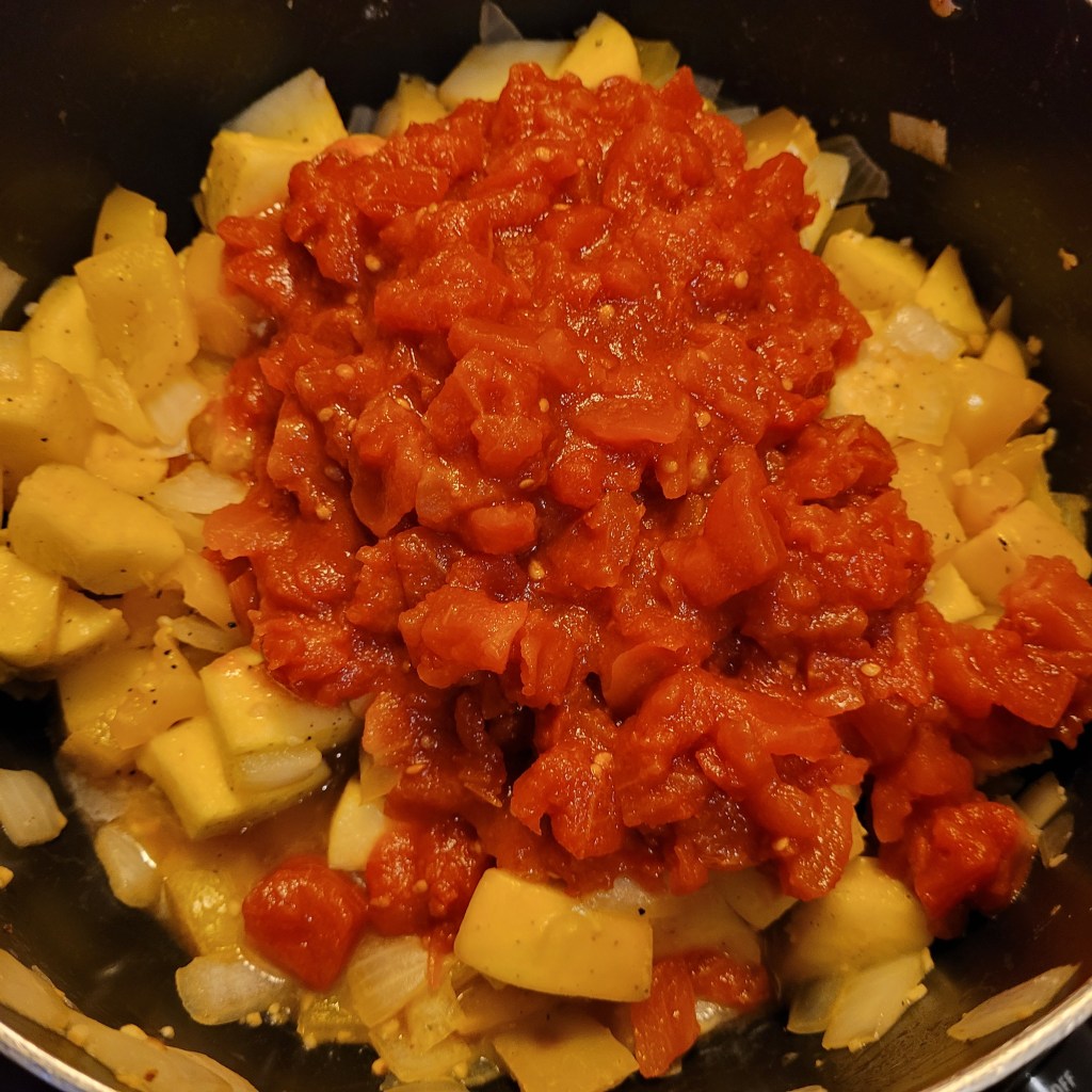 Step six: (Bottom left) Add the can of diced tomatoes and stir.