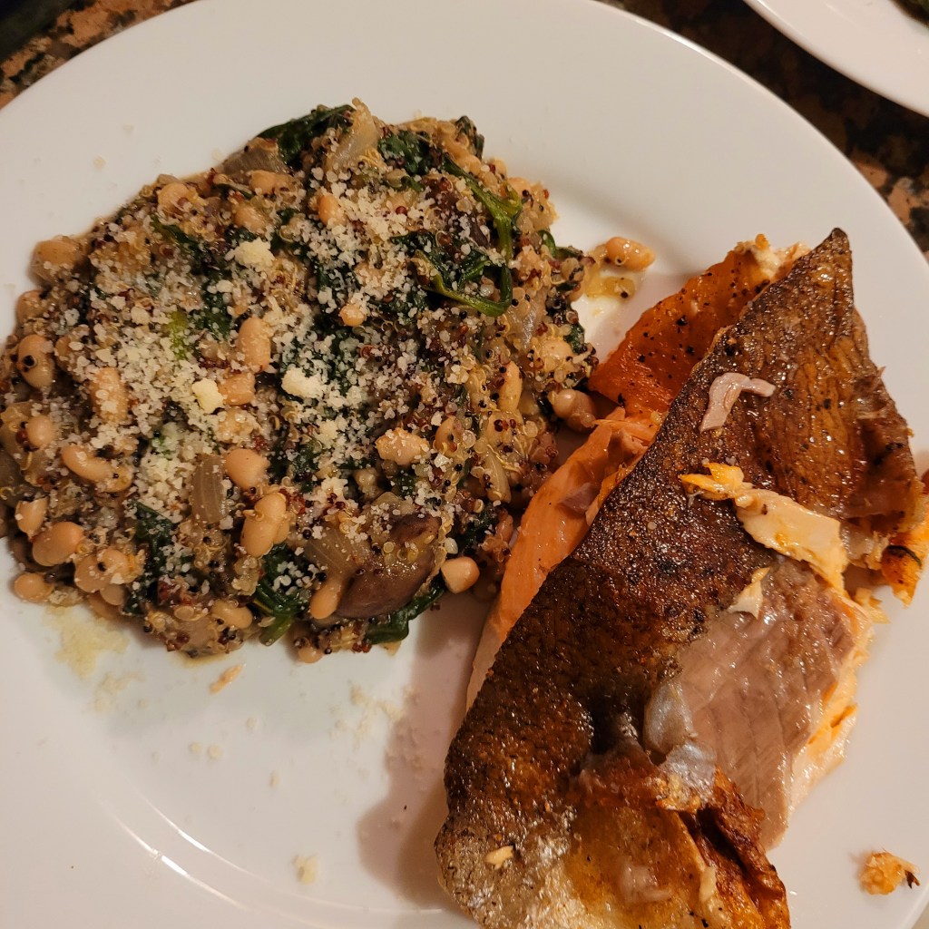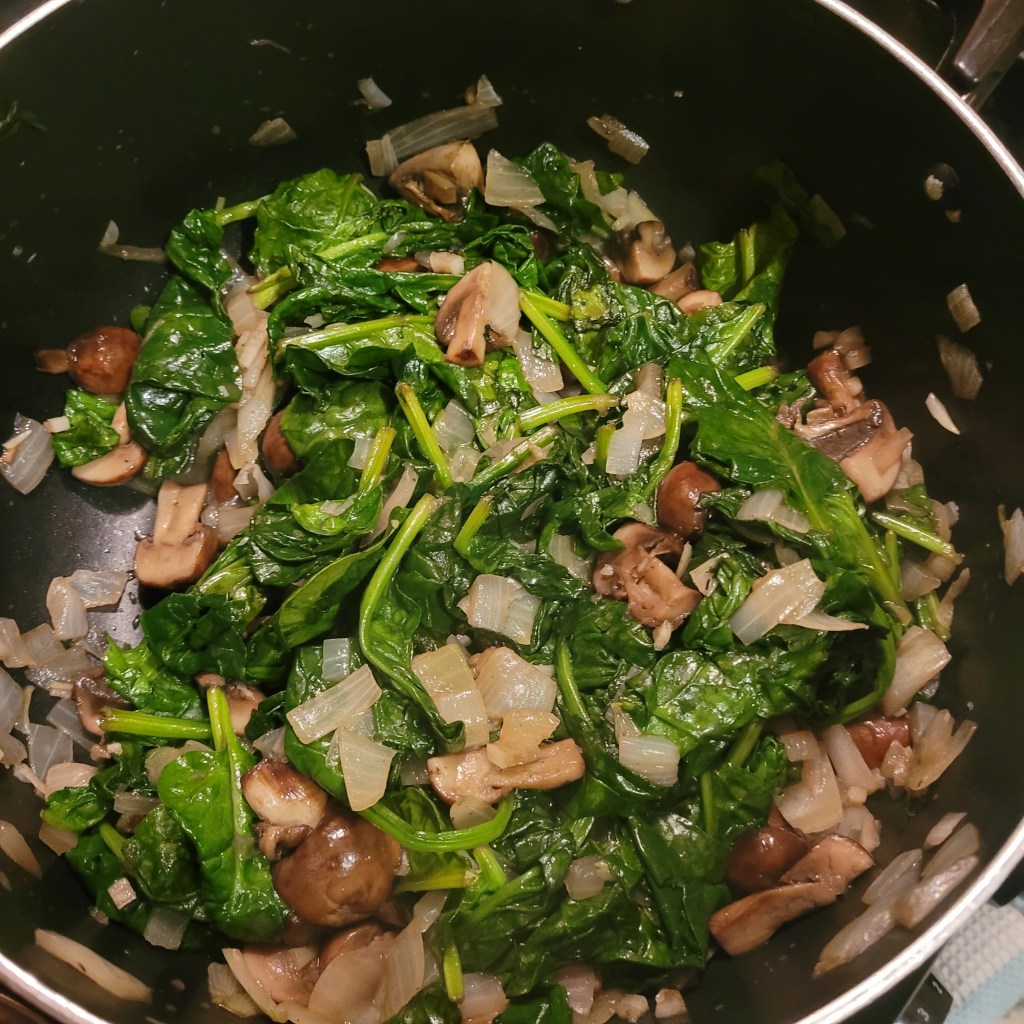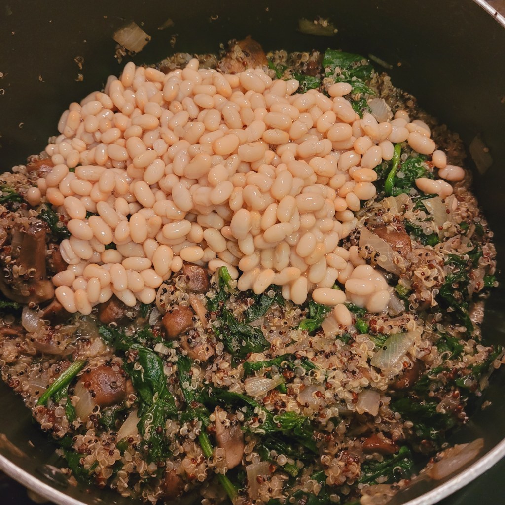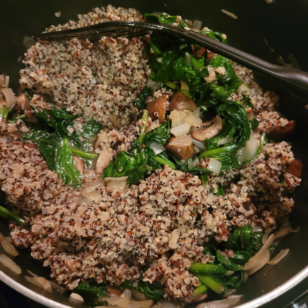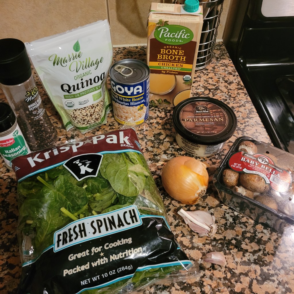 Ingredients: Spinach, quinoa, mushrooms, onion, garlic, parmesan cheese, white beans, Italian seasoning, vegetable masala, veggie broth and lemon.