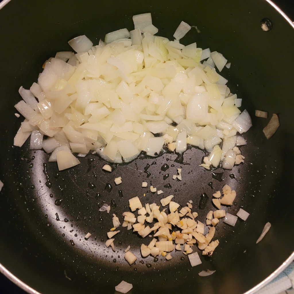 Step three: In a heavy bottom pot with olive oil on medium heat, sauté the onions first! Let it cook for about 3 mins. When 1 minute remains on the clock, add the garlic. Sprinkle a dash of salt. Of course do not forget to stir.