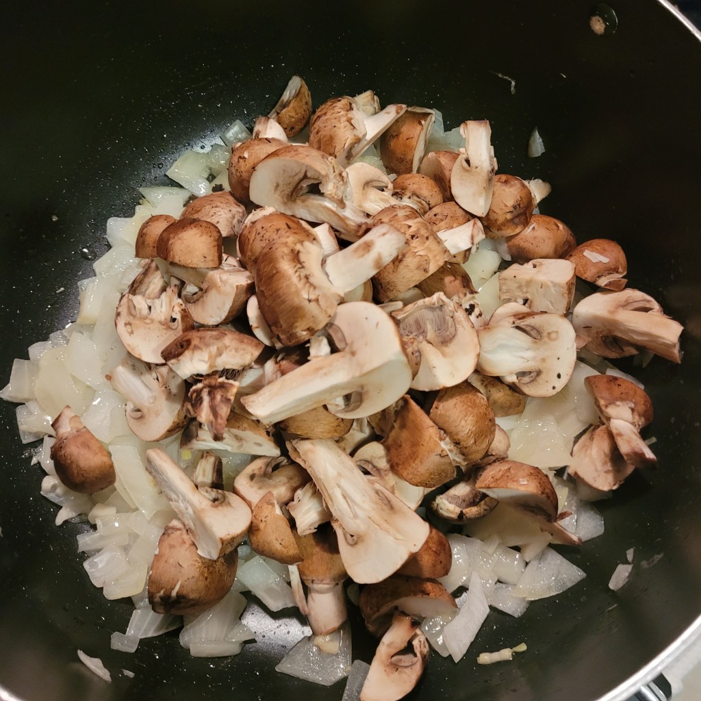 Step four: Add the mushrooms and cook for 3 minutes. Sprinkle a little more salt.